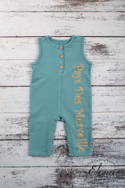 Комбинезон из однотонного футера с лайкрой. Спереди планка с застёжкой на пуговицы и снизу застёжка на кнопки по шаговому шву. Горловина и проймы обработаны бейкой. По низу отвороты, с левой стороны нанесён принт.