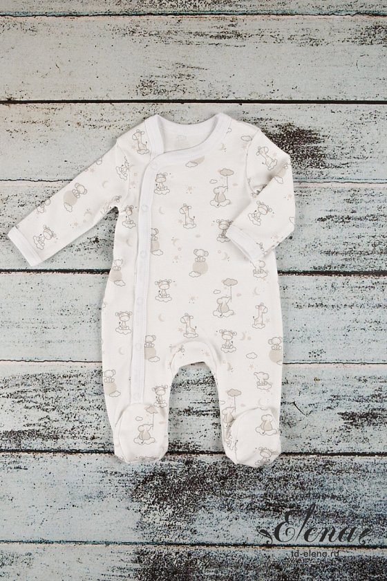 Комбинезончик для девочек выполнен из 100% хлопковой ткани с набивным рисунком. С длинными рукавами под бейку и удобной смещённой застежкой на кнопках по всей длине изделия.