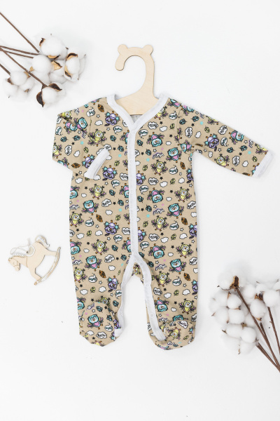 Комбинезон для малышей выполнен из хлопковой ткани с начёсом с набивным рисунком. С длинными рукавами и удобной застёжкой на кнопках по всей длине изделия.