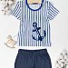 Летний комплект состоит из шорт и футболки. Футболка в полоску из кулирки 100% хлопок, с коротким рукавом и застежкой на кнопки на плече. Спереди расположен принт. Шорты из джинсовой ткани с поясом на резинке.