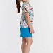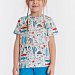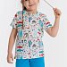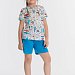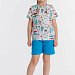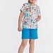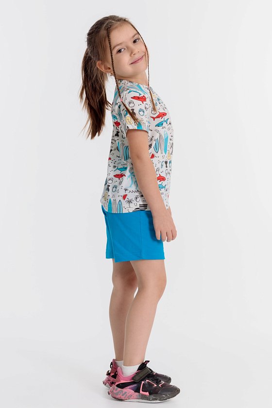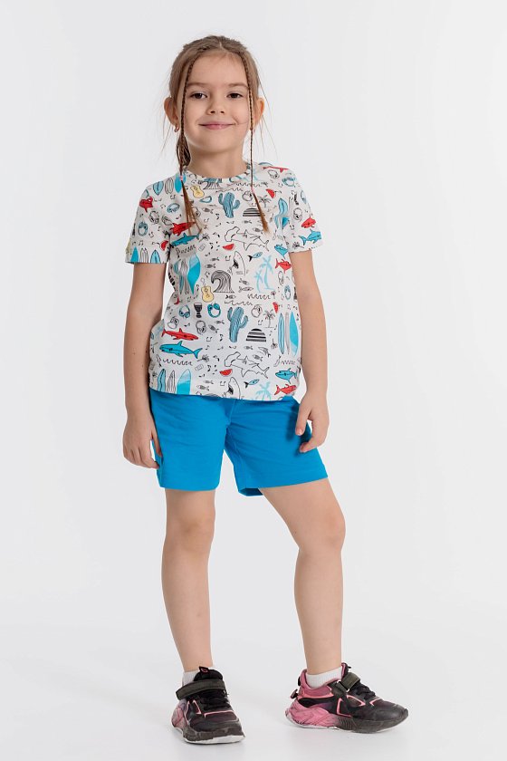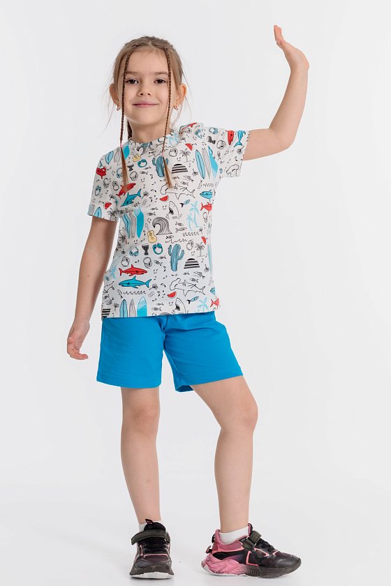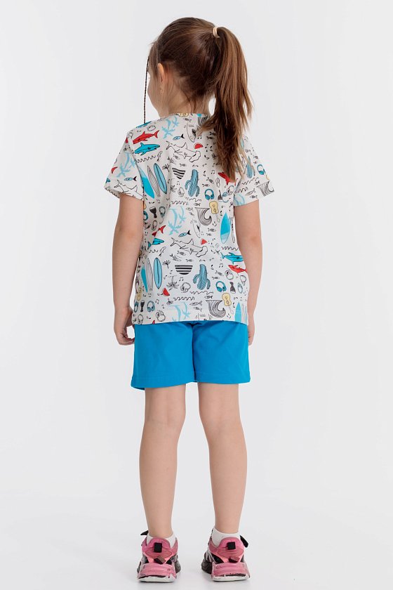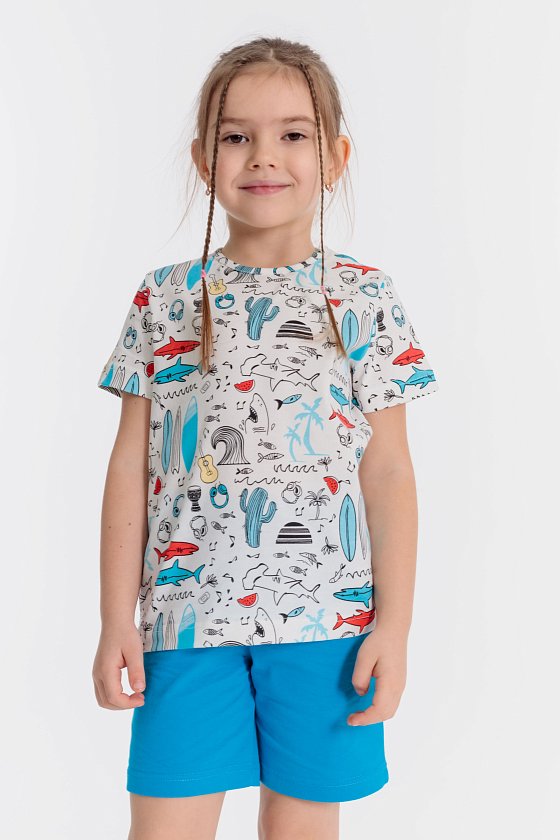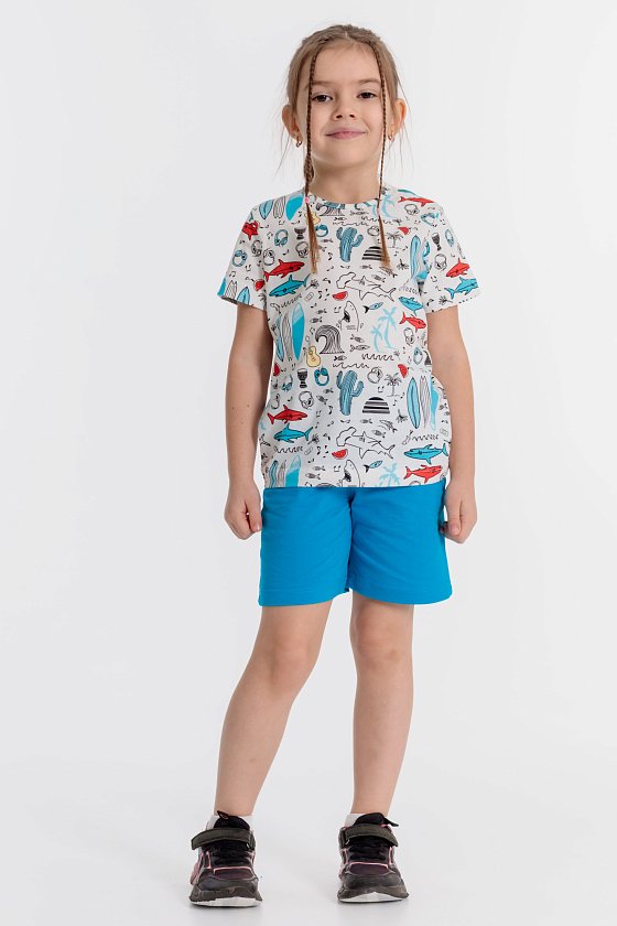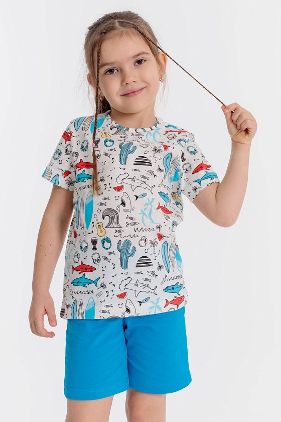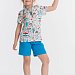 Летний комплект состоит из шорт и футболки. Футболка из кулирки с набивным рисунком. Застёжка на кнопки на плече. Рукав короткий. Шорты однотонные, пояс на резинке.