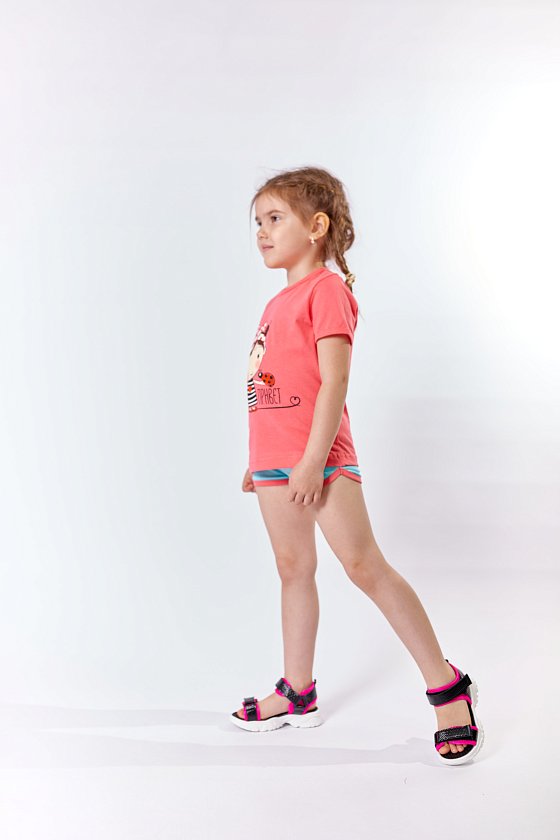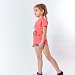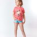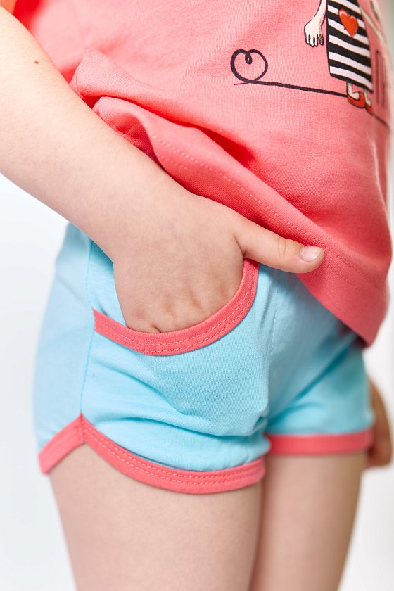 Костюм детский выполнен из кулирки, 100% хлопок. Футболка с коротким рукавом, на правом плече застёжка на пуговицы. Горловина и низ рукавов обработаны бейкой. Спереди на футболке нанесён принт. Шорты обработаны бейкой контрастного цвета, пояс на резинке, по бокам расположены карманы.