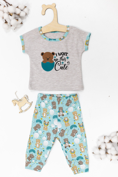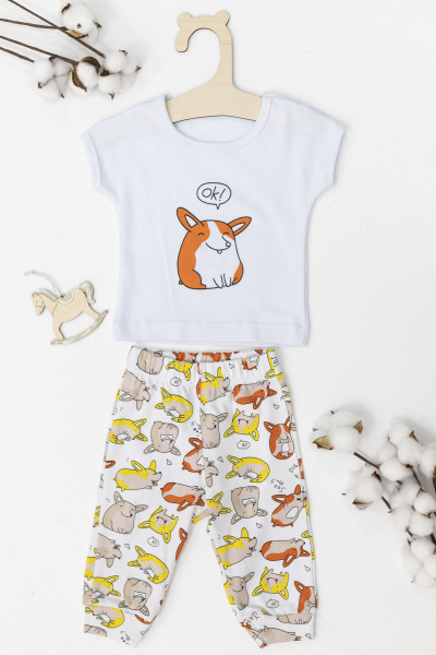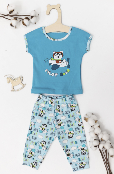 Костюм детский выполнен из интерлока. Футболка с коротким рукавом, с круглым вырезом горловины и принтом спереди. Брюки на манжете снизу и резине по поясу.