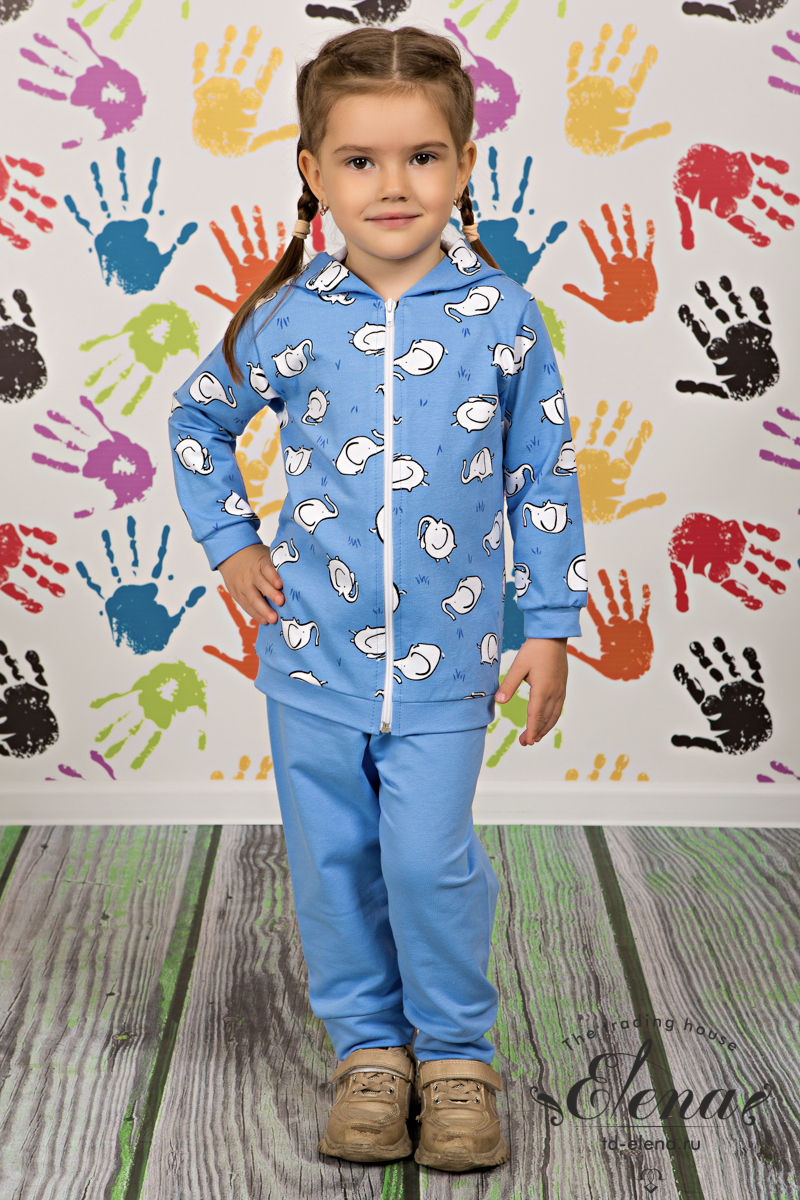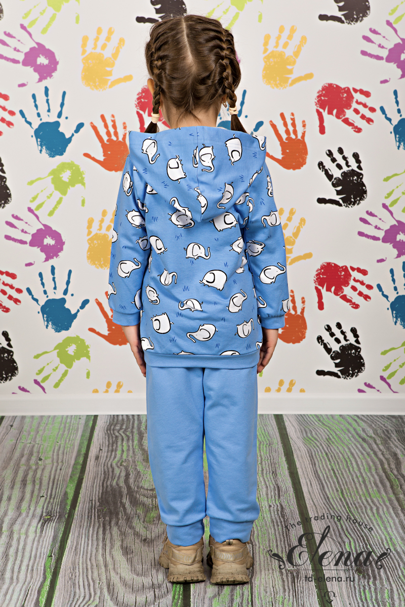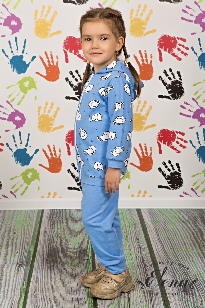Детский костюм из футера c лайкрой, состоит из брюк и толстовки. Толстовка с капюшоном, длинными рукавами и центральной застёжкой на молнию. Брюки однотонные с притачной манжетой и поясом на резинке.
