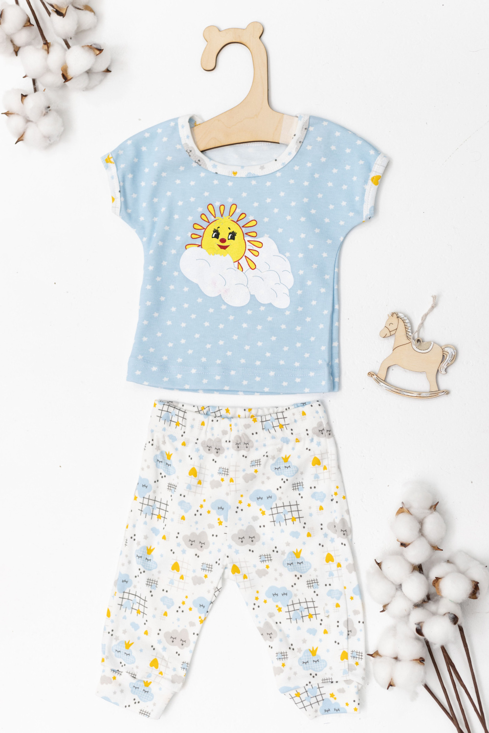 Костюм детский выполнен из интерлока. Футболка с коротким рукавом, с круглым вырезом горловины и принтом спереди. Брюки на манжете снизу и резине по поясу.