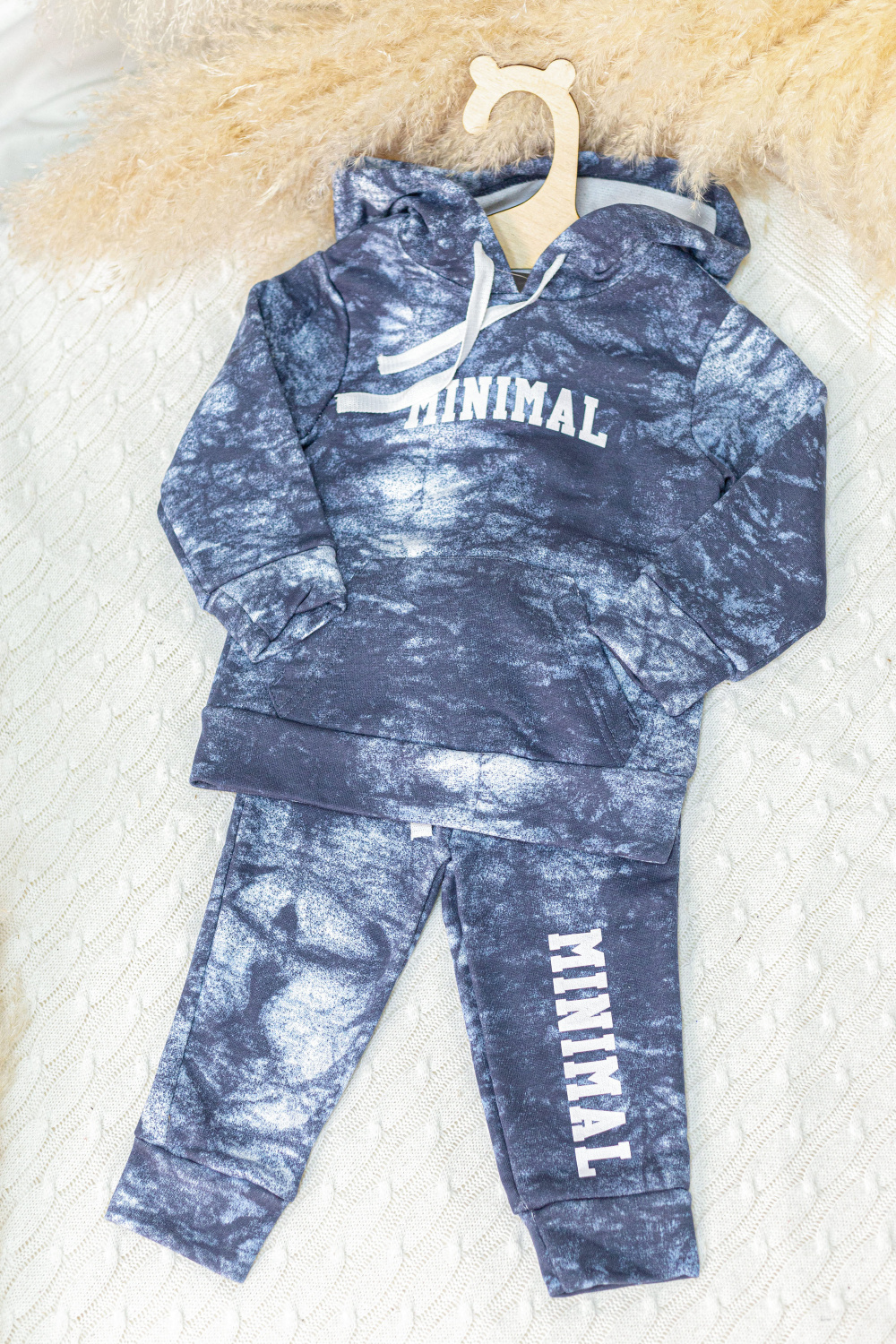 Толстовка с капюшоном со шнуром, длинными рукавами с манжетами и притачным поясом обеспечит комфорт и тепло. Спереди карман-кенгуру можно использовать для хранения платочка. Принт на полочке и штанине добавит изюминку и уникальность костюму.