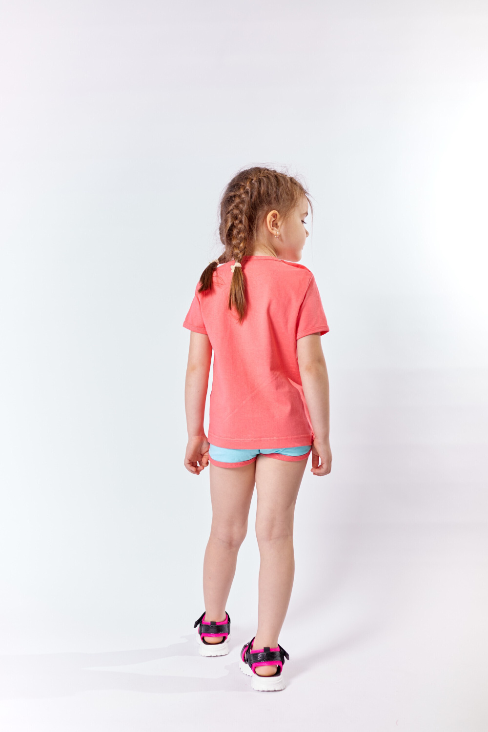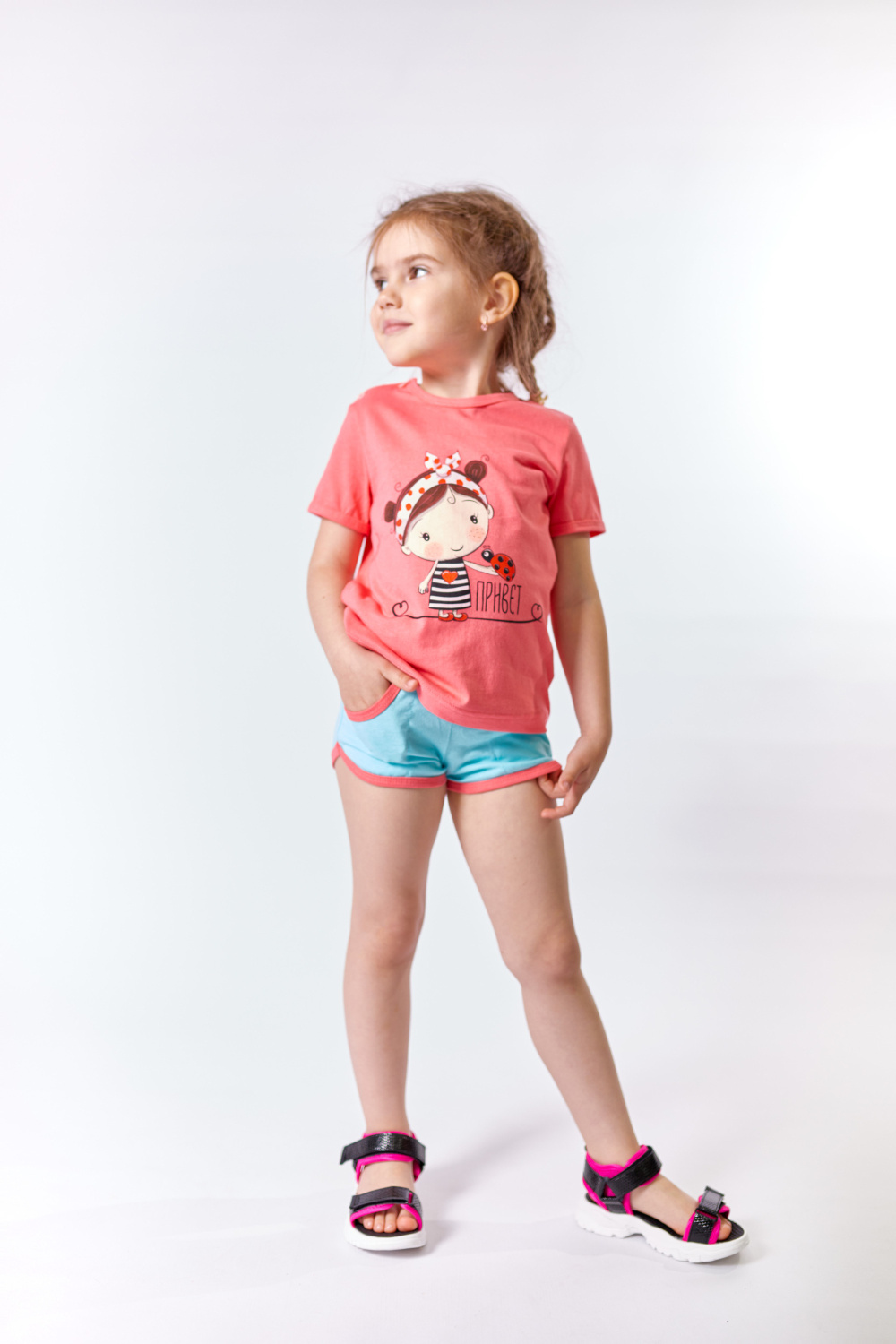 Костюм детский выполнен из кулирки, 100% хлопок. Футболка с коротким рукавом, на правом плече застёжка на пуговицы. Горловина и низ рукавов обработаны бейкой. Спереди на футболке нанесён принт. Шорты обработаны бейкой контрастного цвета, пояс на резинке, по бокам расположены карманы.