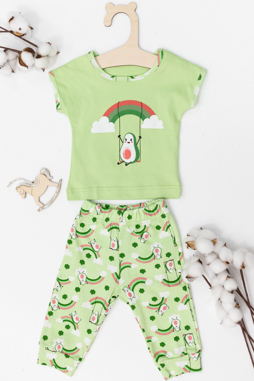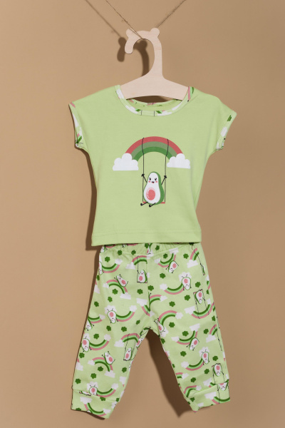 Костюм детский выполнен из интерлока. Футболка с коротким рукавом, с круглым вырезом горловины и принтом спереди. Брюки на манжете снизу и резине по поясу.