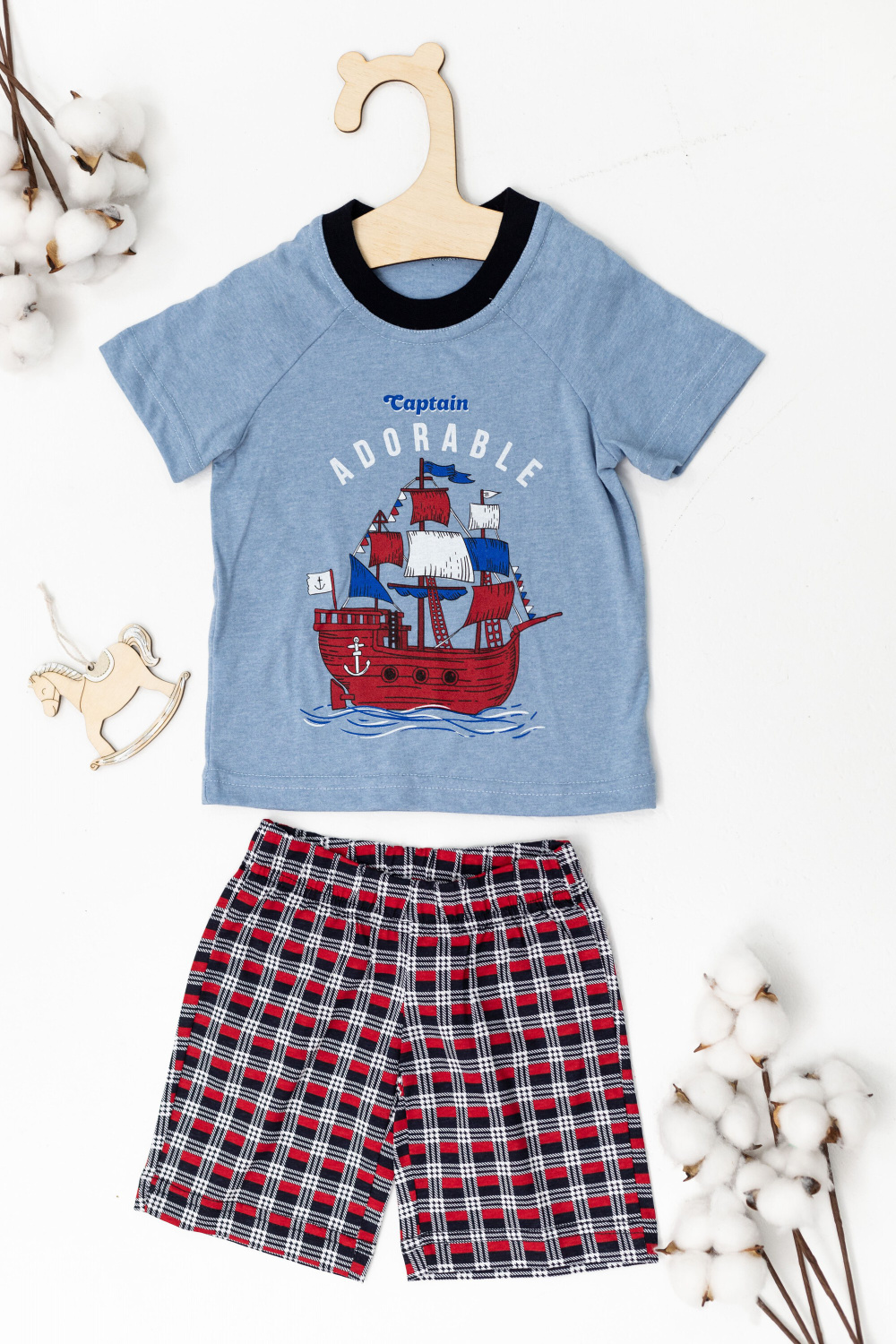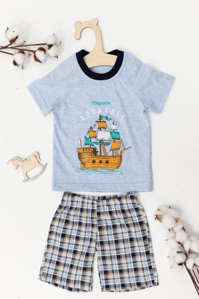 Костюм выполнен из кулирки, 100% хлопок, состоит из шорт и футболки. Футболка из однотонная, с круглым вырезом горловины и принтом спереди. Короткий рукав покроя реглан. Шорты из кулирки с набивным рисунком, пояс на резине.