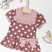 Платье выполнено из кулирки, 100% хлопок. Изделие с коротким рукавом, застёжка на кнопках на плече. Спереди платье украшено оборкой и бантом.