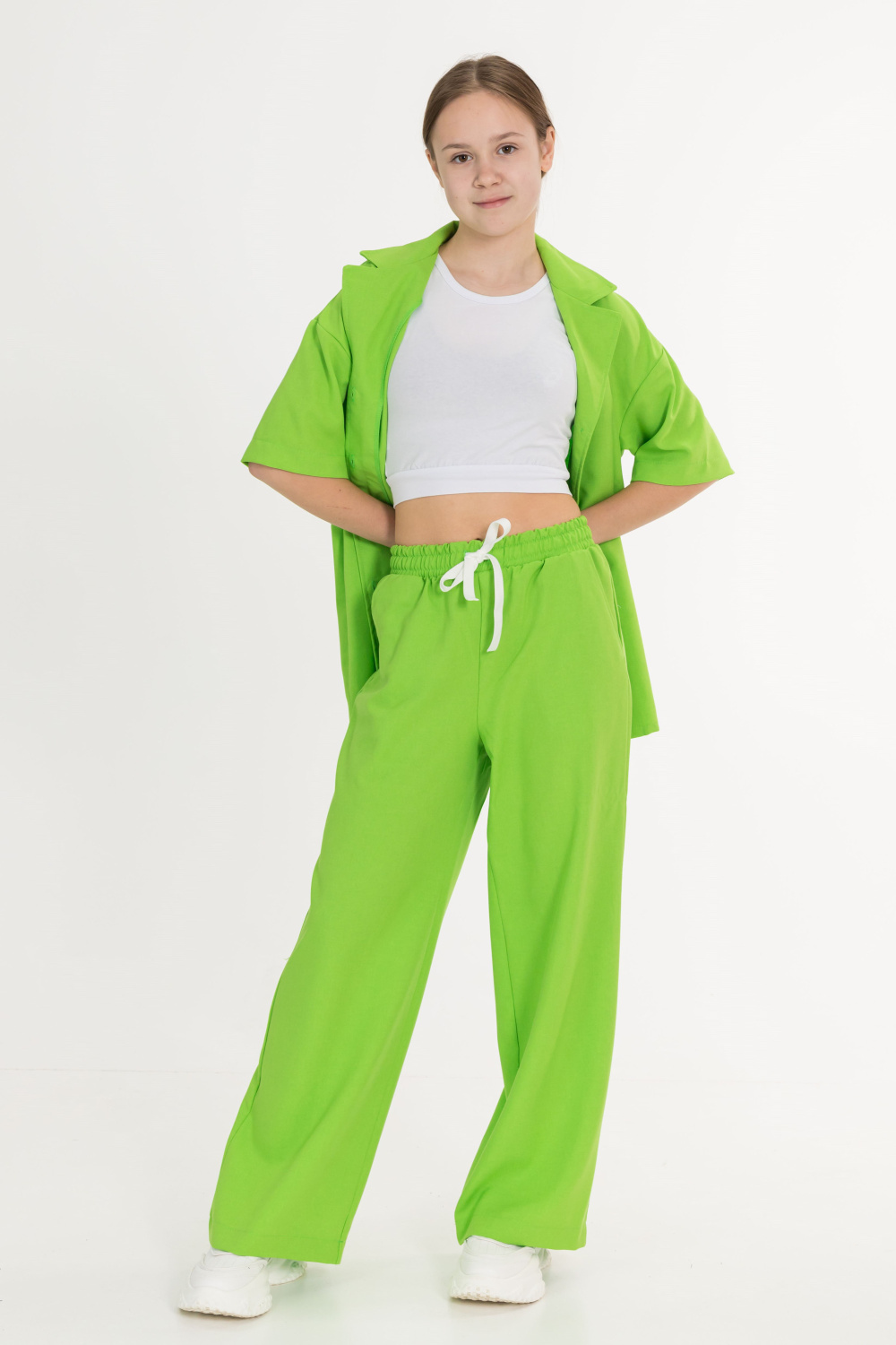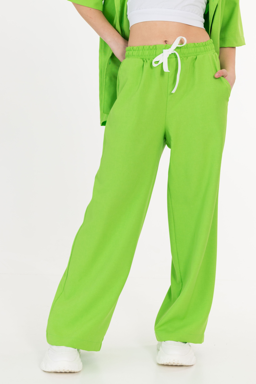 Брюки имеют свободный крой, пояс на резинке и шнуре, что обеспечивает комфортную посадку и позволяет регулировать обхват талии. Боковые карманы добавляют функциональность.