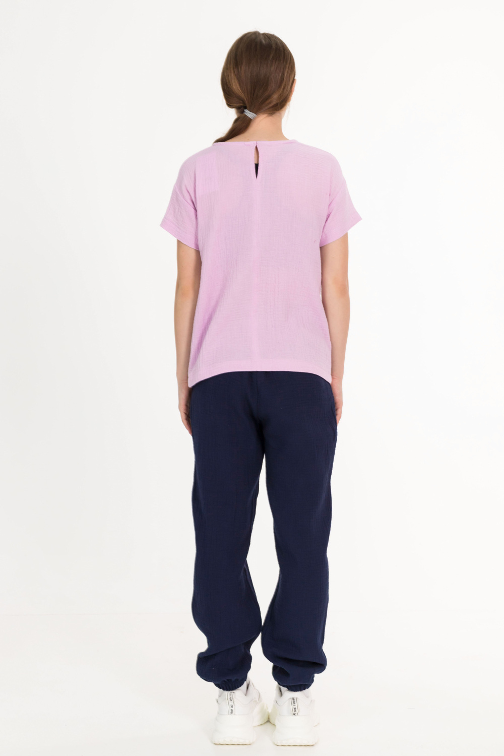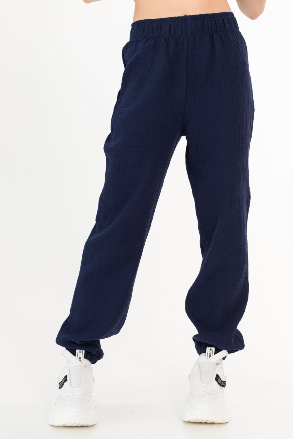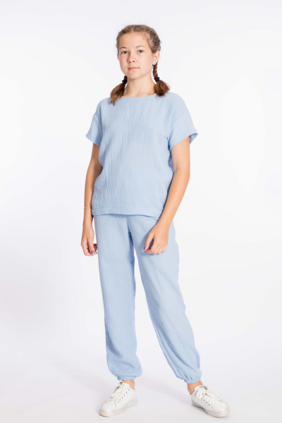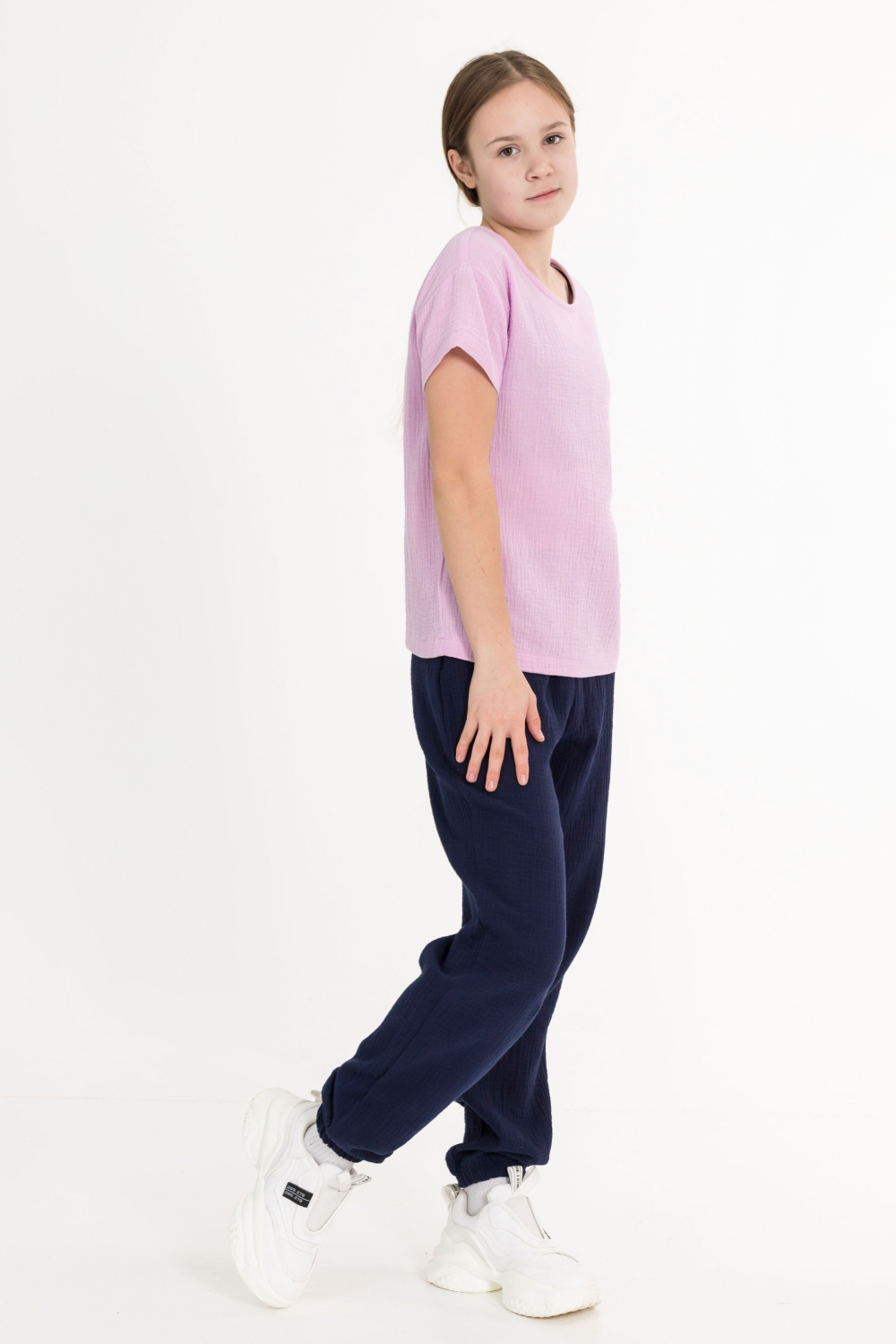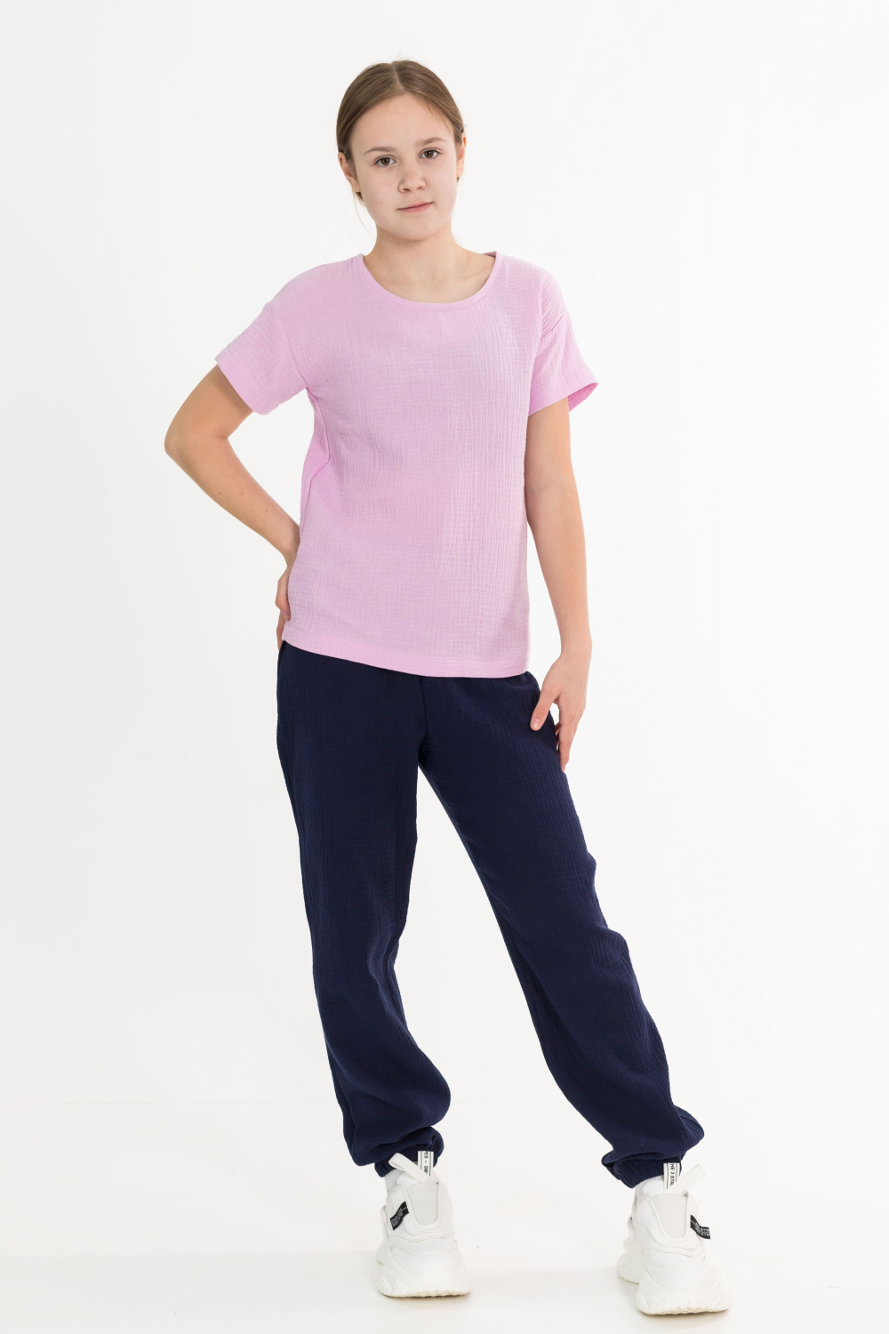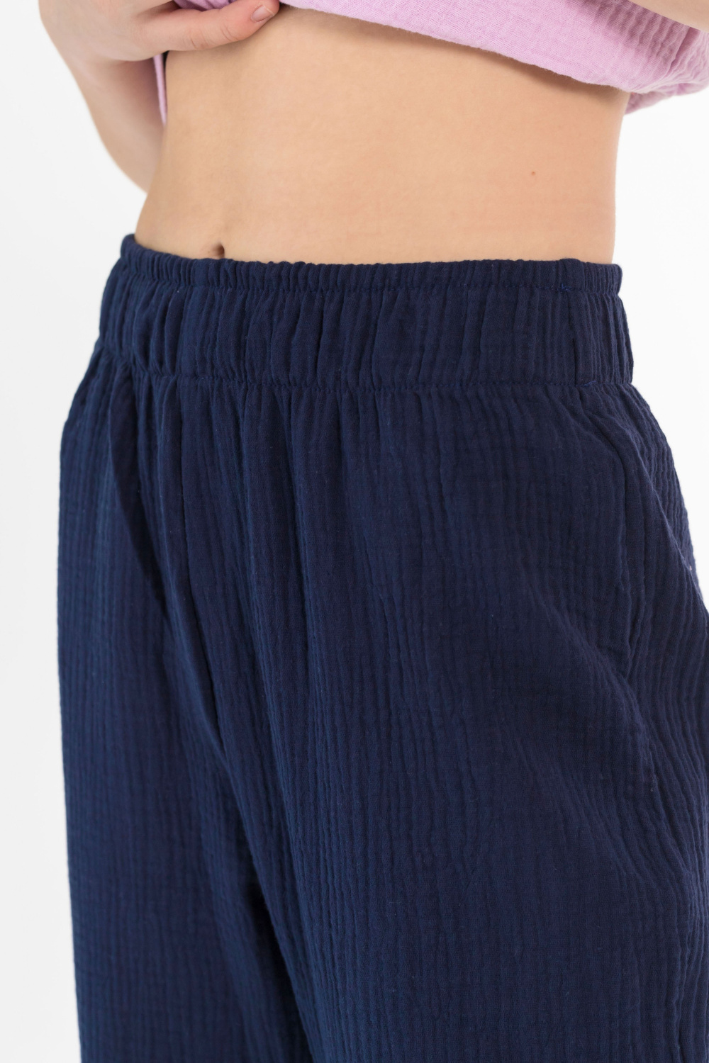 Детские летние брюки выполнены из муслина. Пояс и низ брюк на резинке.