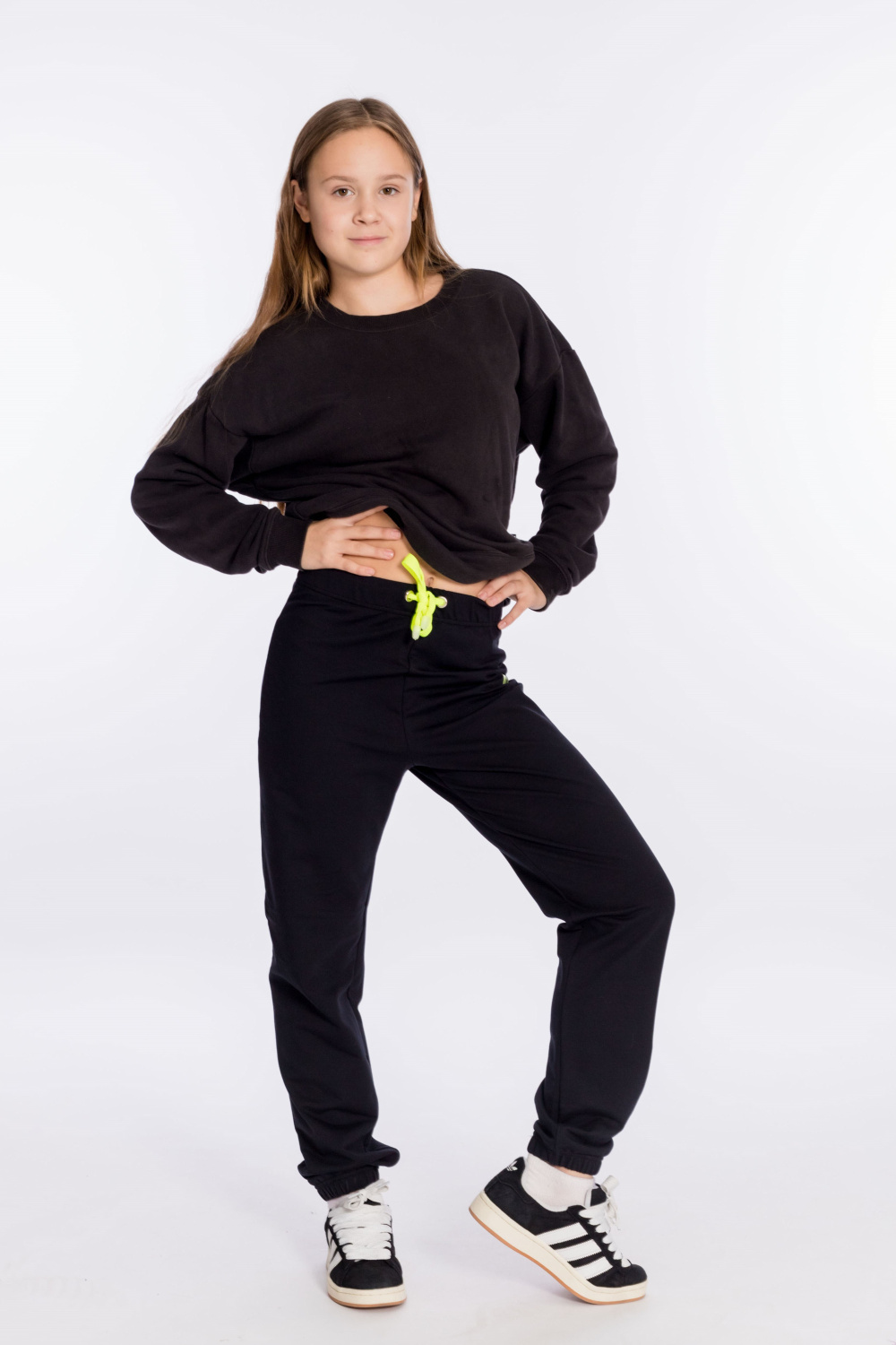 Брюки выполнены из однотонного футера с лайкрой. Пояс и низ брюк на резинке. В поясе через люверсы проложен декоративный шнур, с левой стороны на брюках нанесён термопринт.