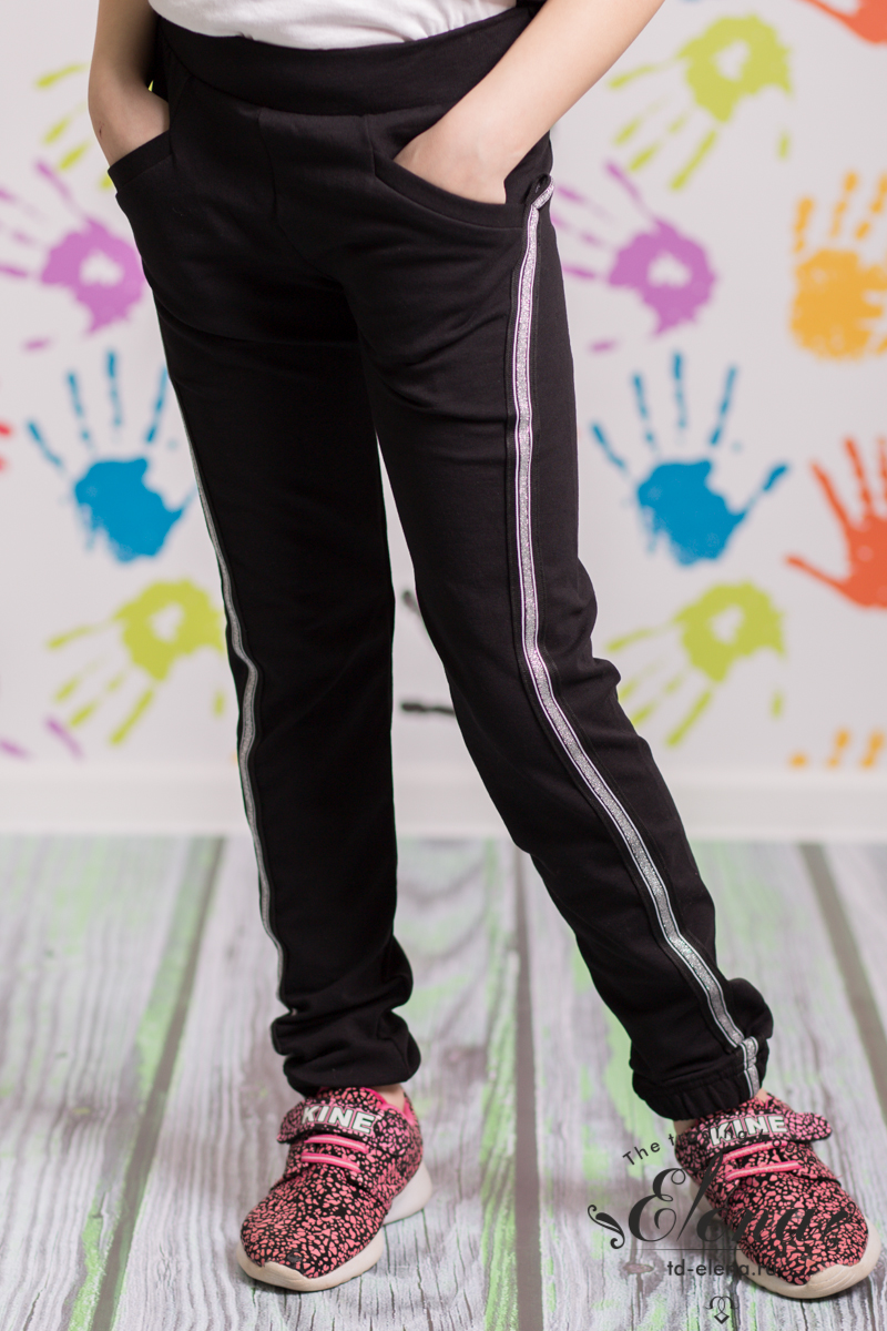 Брюки для девочки выполнены из футер петли с лайкрой. Брюки с карманами спереди, с фигурными швами и пришивными лампасами. На резине по поясу и низу.