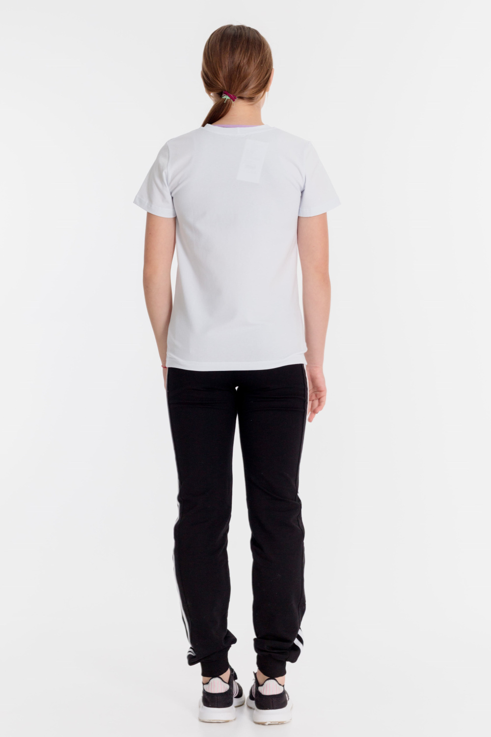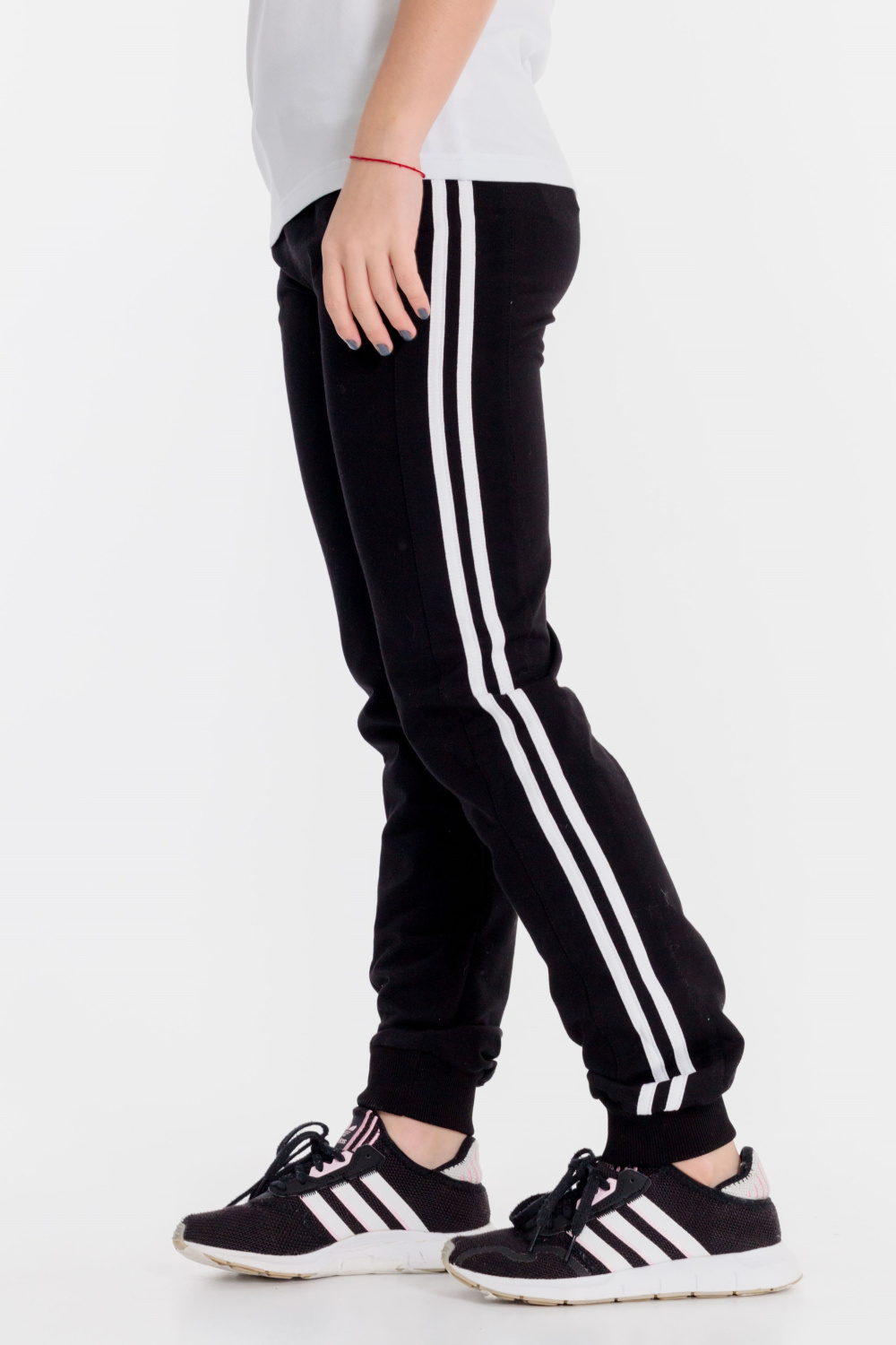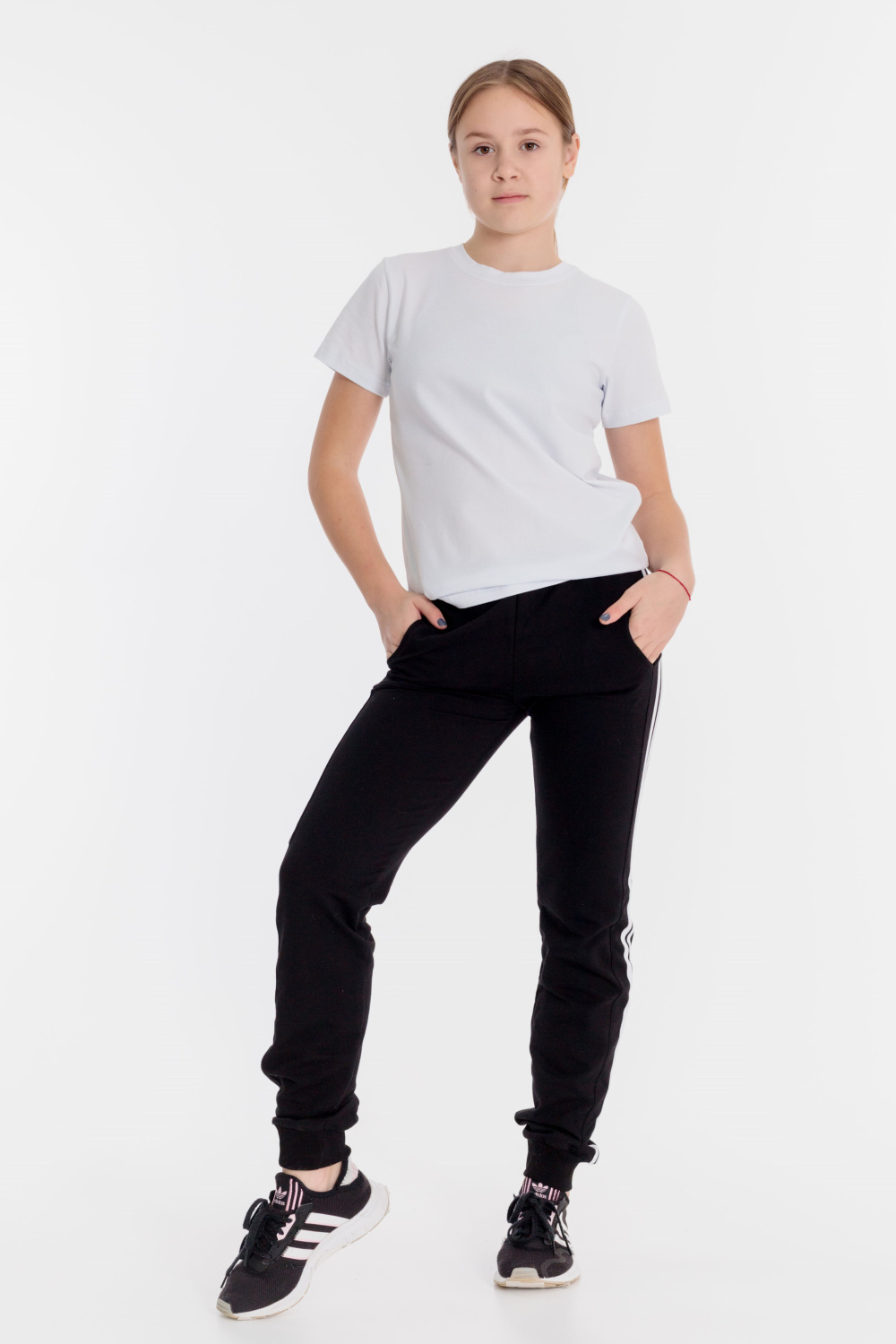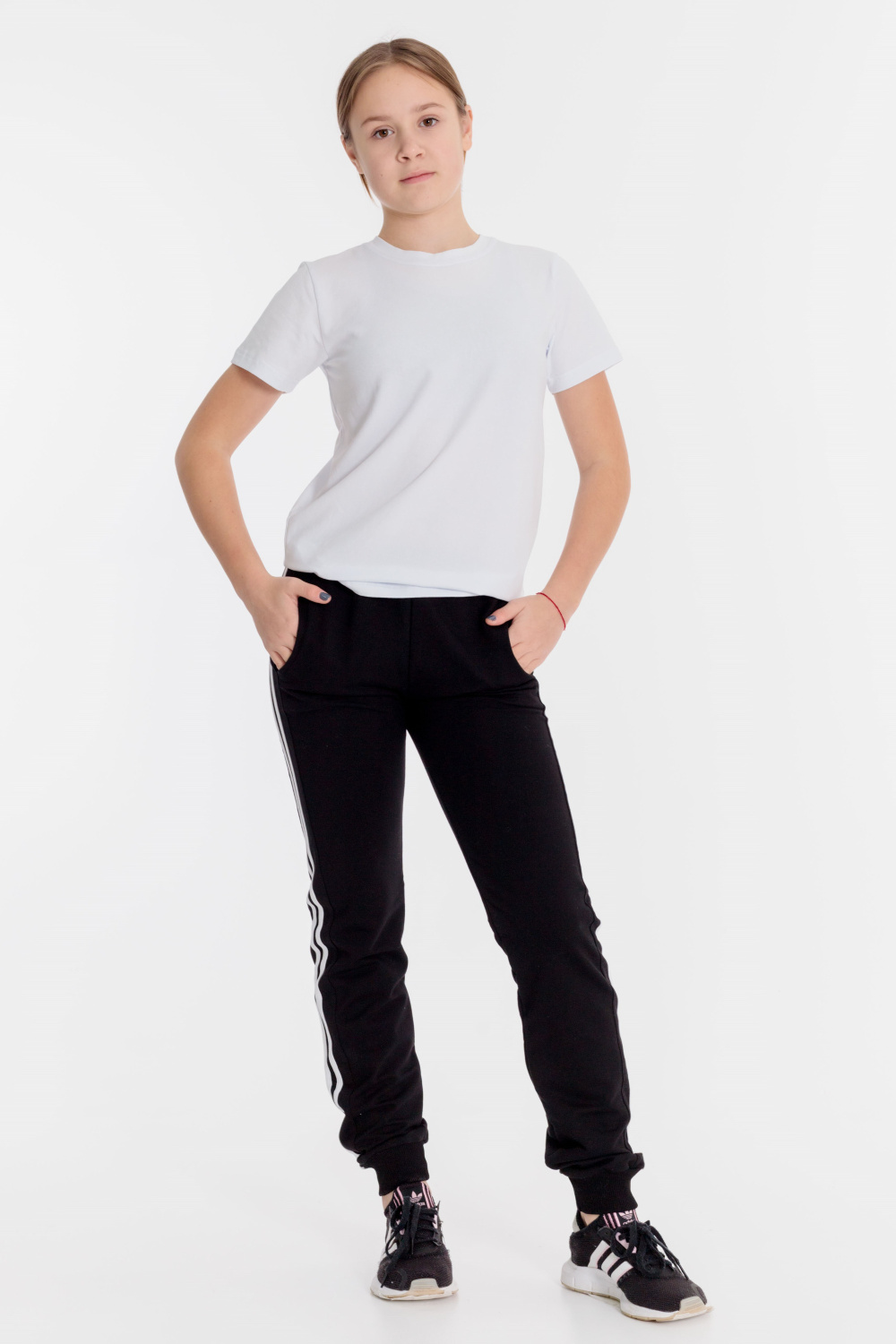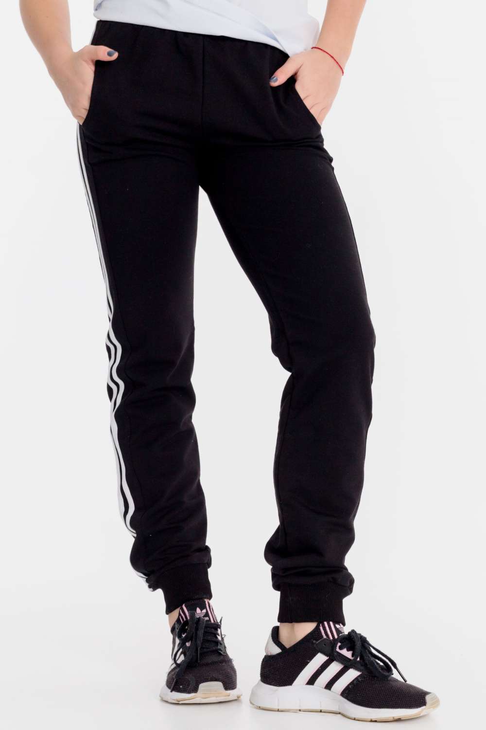 Брюки детские выполнены из футер петли различных цветов. По бокам со вставками, на которых сделаны лампасы, спереди прорезные карманы, пояс на резине, низ брюк на манжетах.