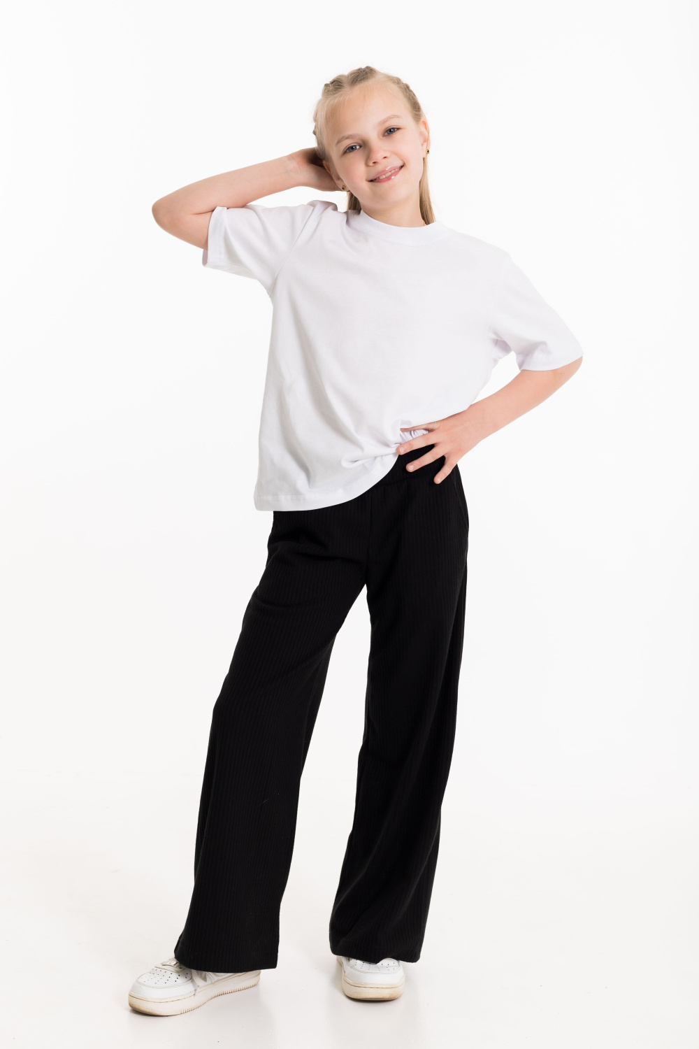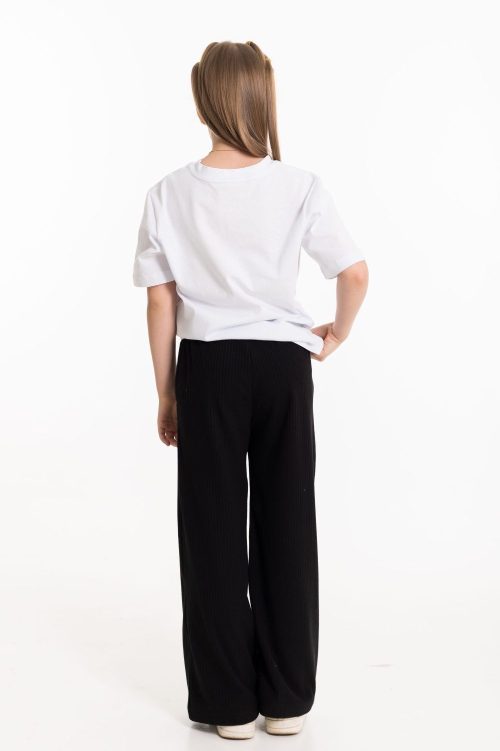 Брюки выполнены из синтетического полотна "лапша". Брюки свободного кроя, с притачным поясом и карманами по бокам.