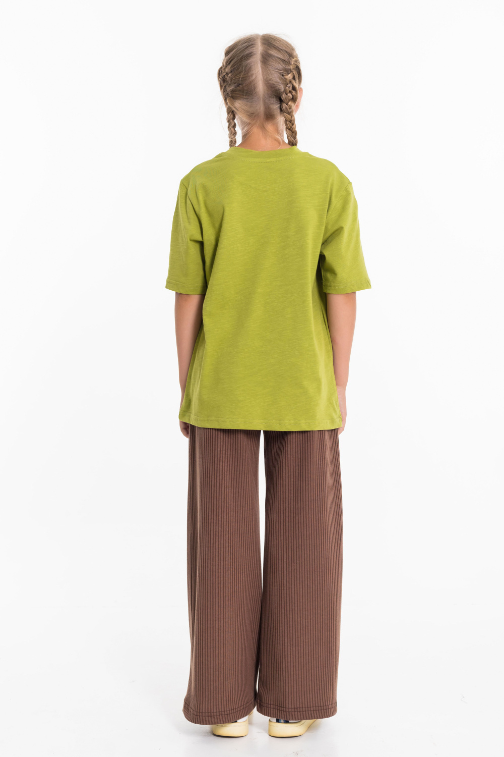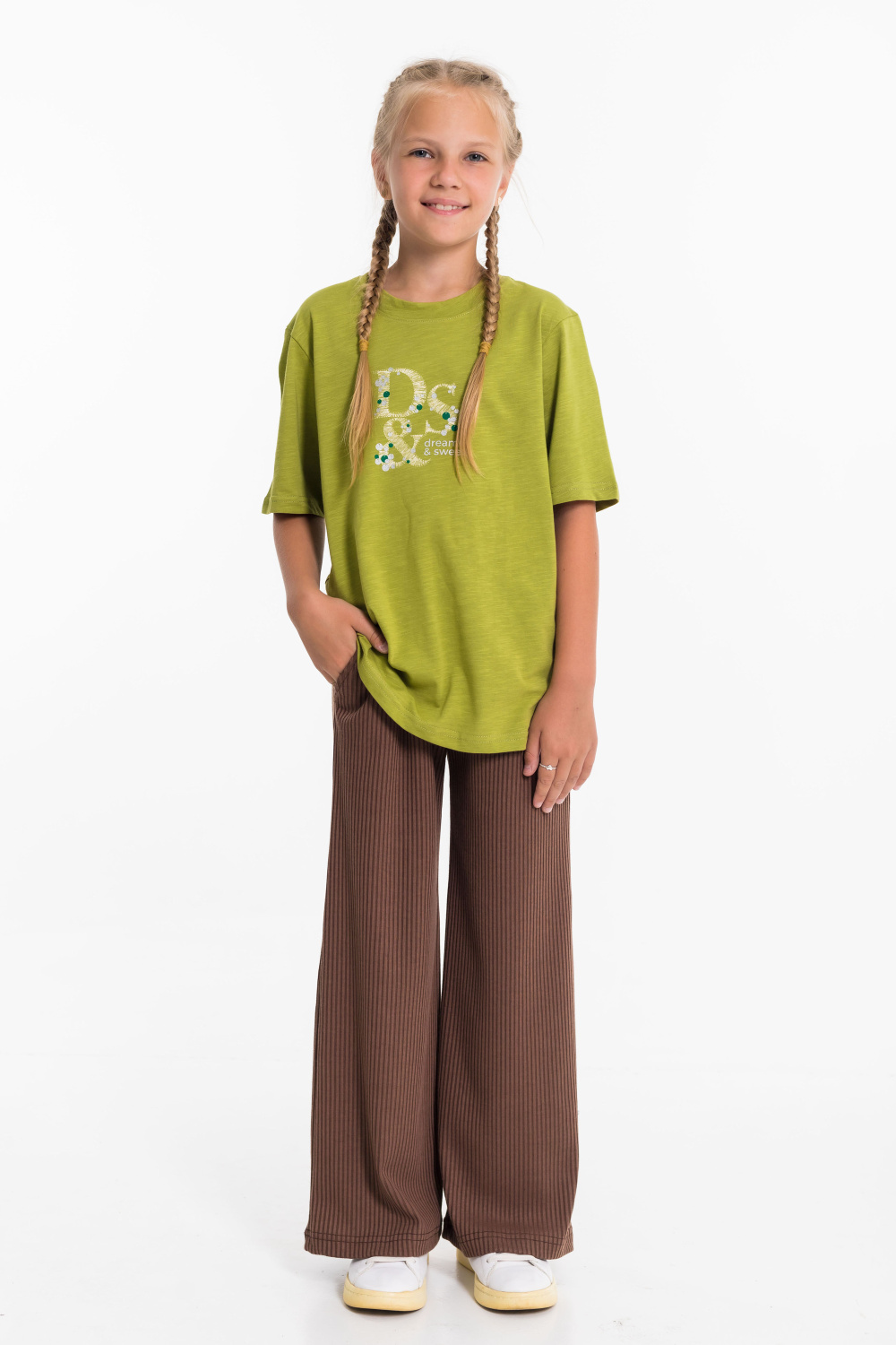 Брюки выполнены из синтетического полотна "лапша". Брюки свободного кроя, с притачным поясом и карманами по бокам.
