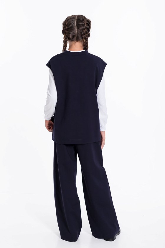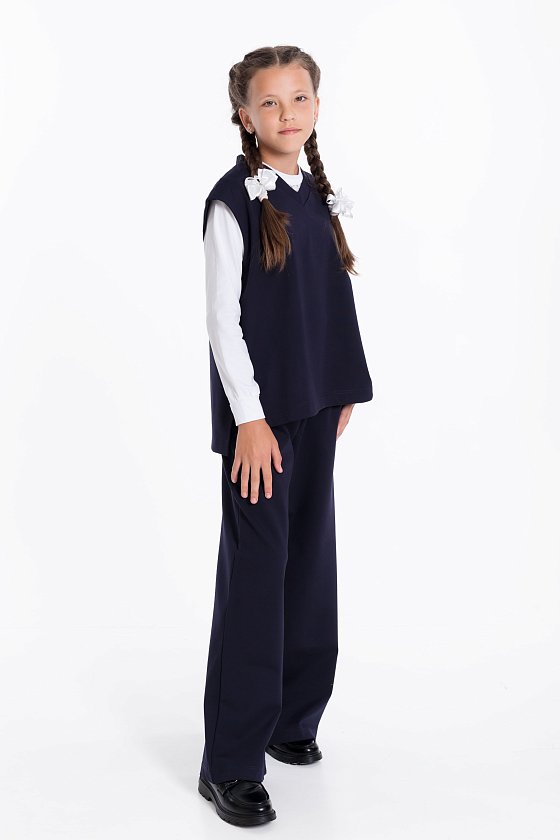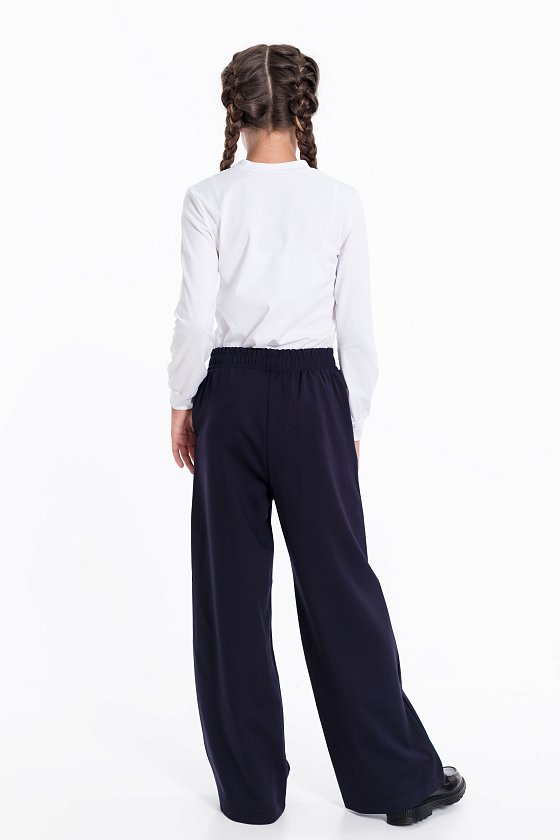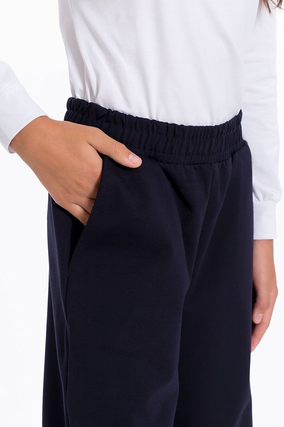 Брюки для девочки из однотонного полотна "академик" по типу "палаццо" с боковыми карманами и притачным поясом на резинке.