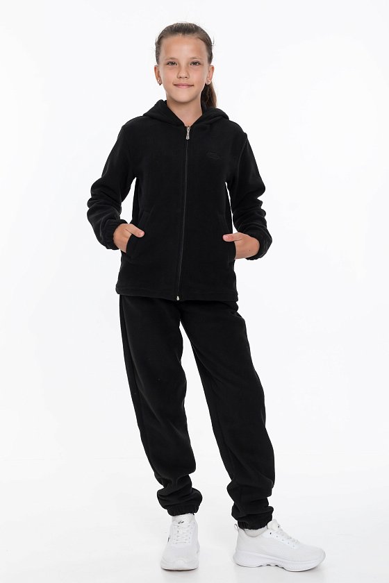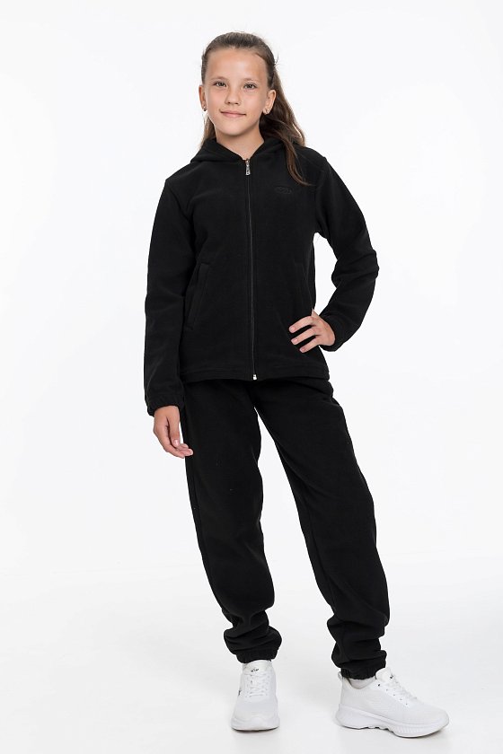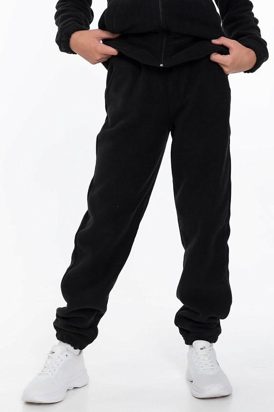 Брюки для девочки из флиса черного цвета. Брюки прямого кроя с поясом на резинке и шнуре обеспечивают комфортную посадку и не сковывают движения. Манжеты на резинке по низу штанин защитят от холода. Боковые карманы делают модель более функциональной и удобной.