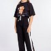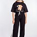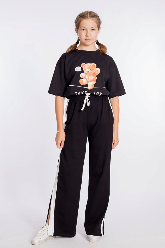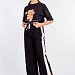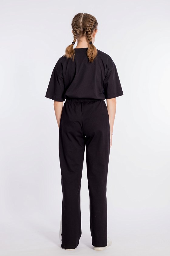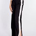 Брюки свободного кроя выполнены из кулирки с лайкрой, с лампасами и разрезами по бокам. Для лучшей фиксации на талии в пояс вставлена резинка и шнур.