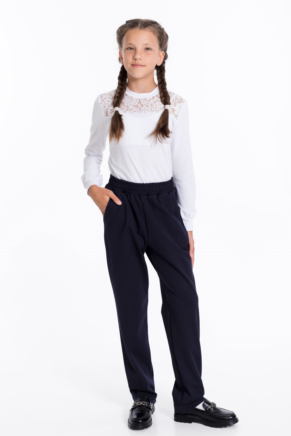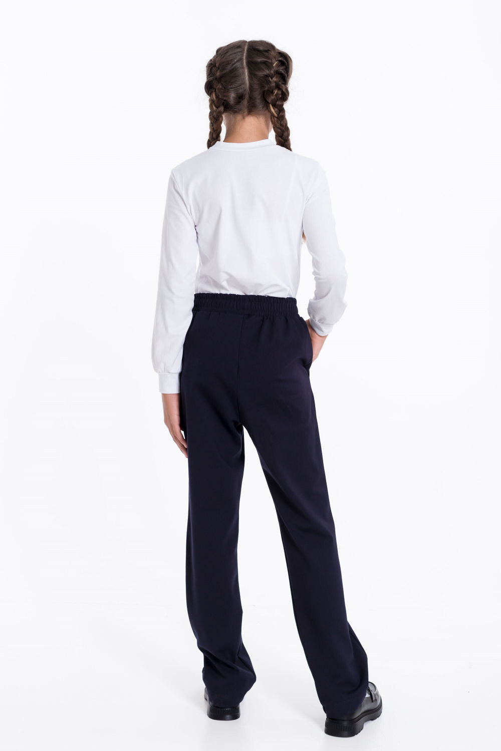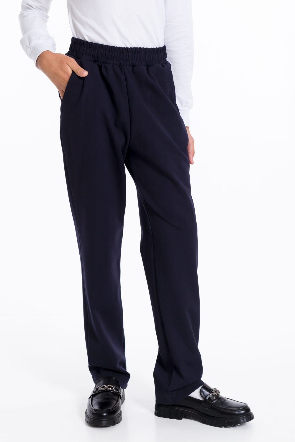 Брюки для девочек классические из однотонного полотна "академик" с притачным поясом и боковыми карманами.