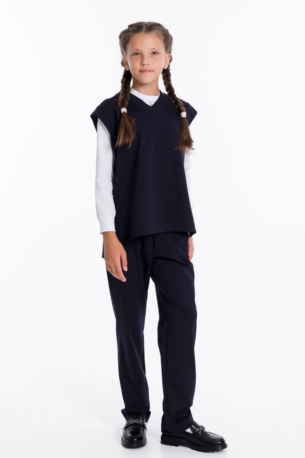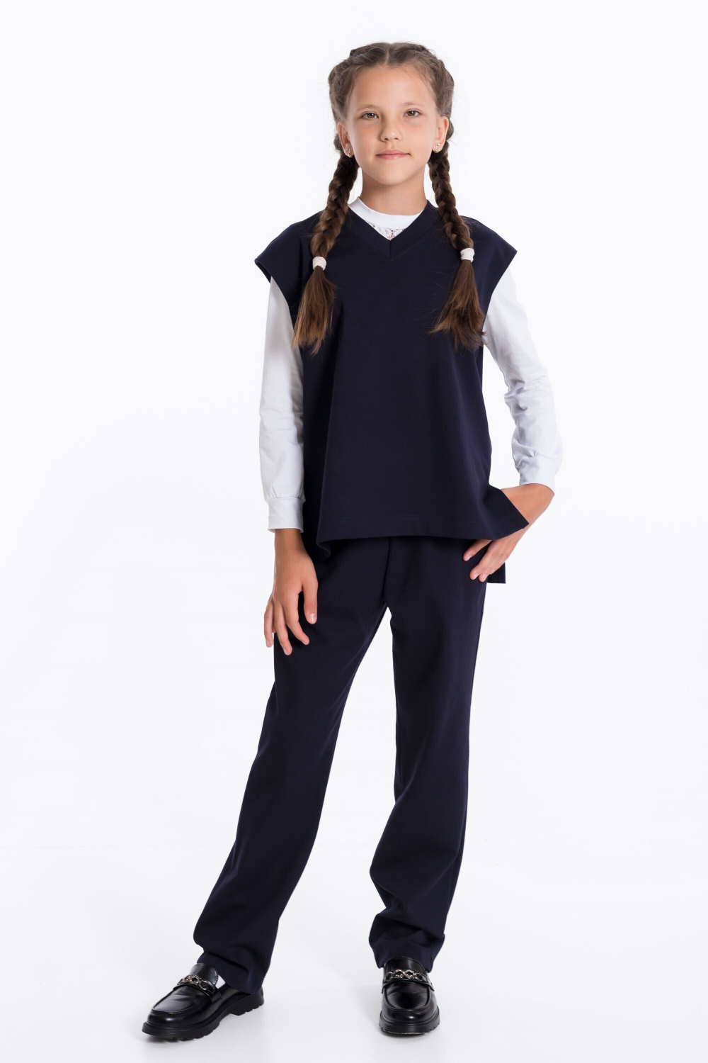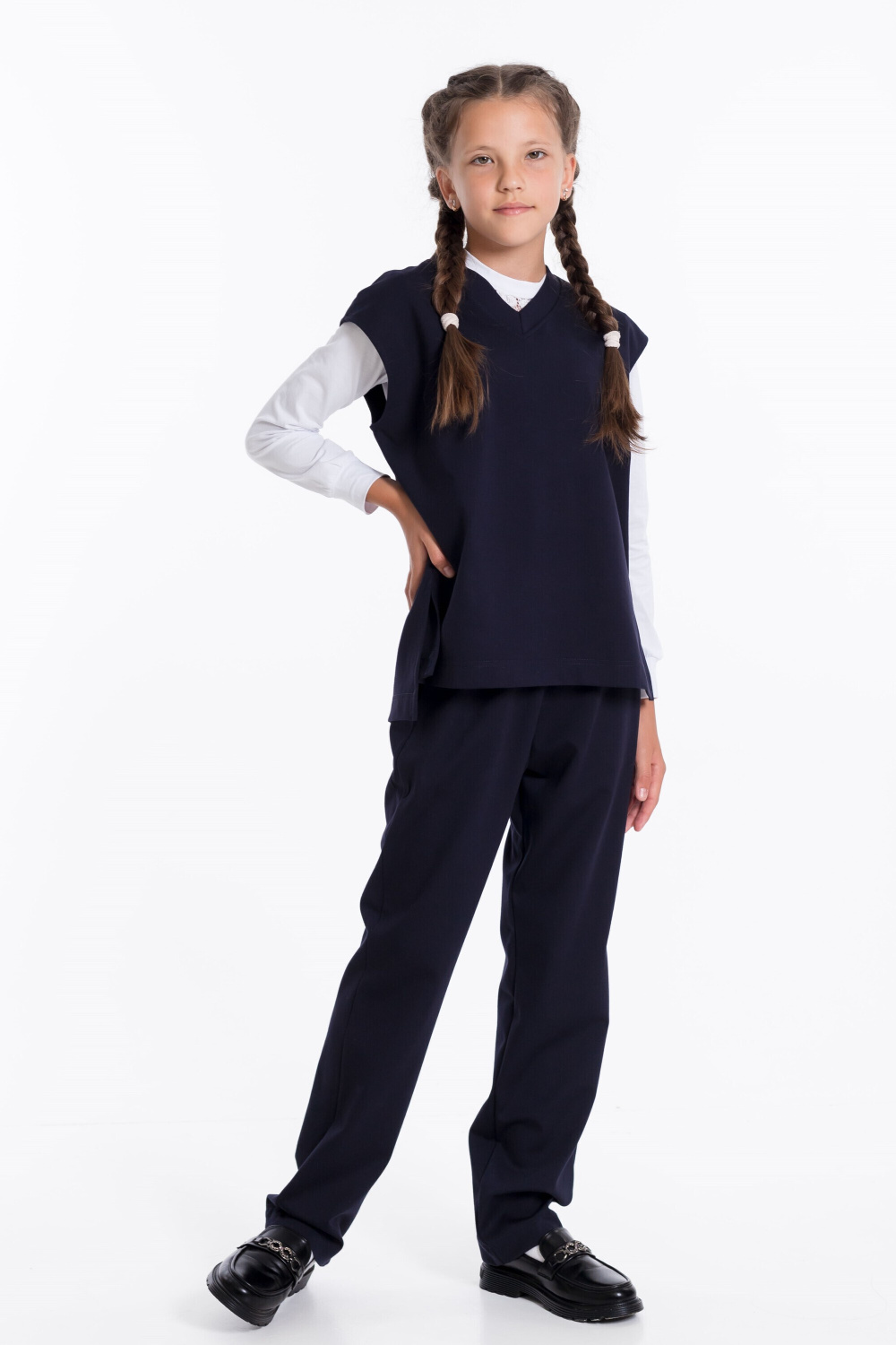 Брюки для девочек классические из однотонного полотна "академик" с притачным поясом и боковыми карманами.