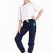 Брюки выполнены из однотонного футера с лайкрой. Пояс и низ брюк на резинке. В поясе через люверсы проложен декоративный шнур, с левой стороны на брюках нанесён термопринт.