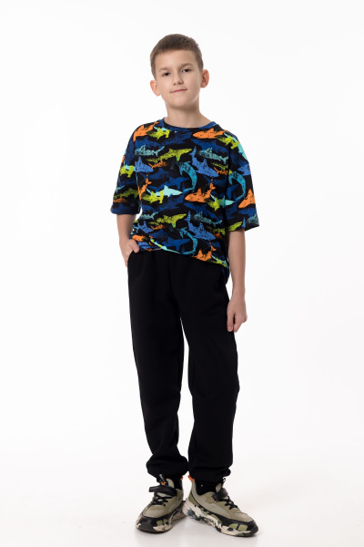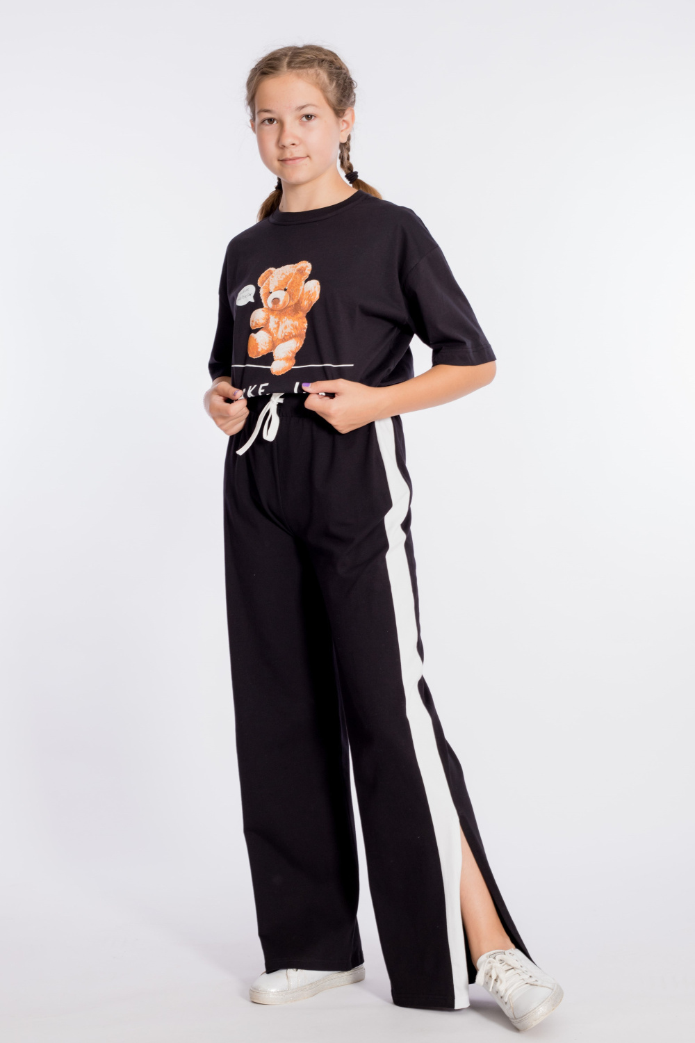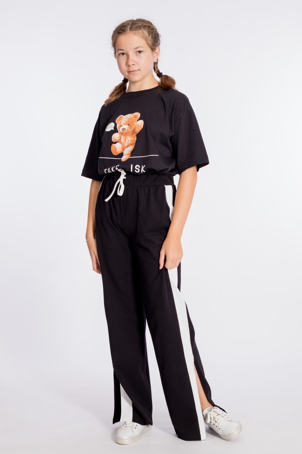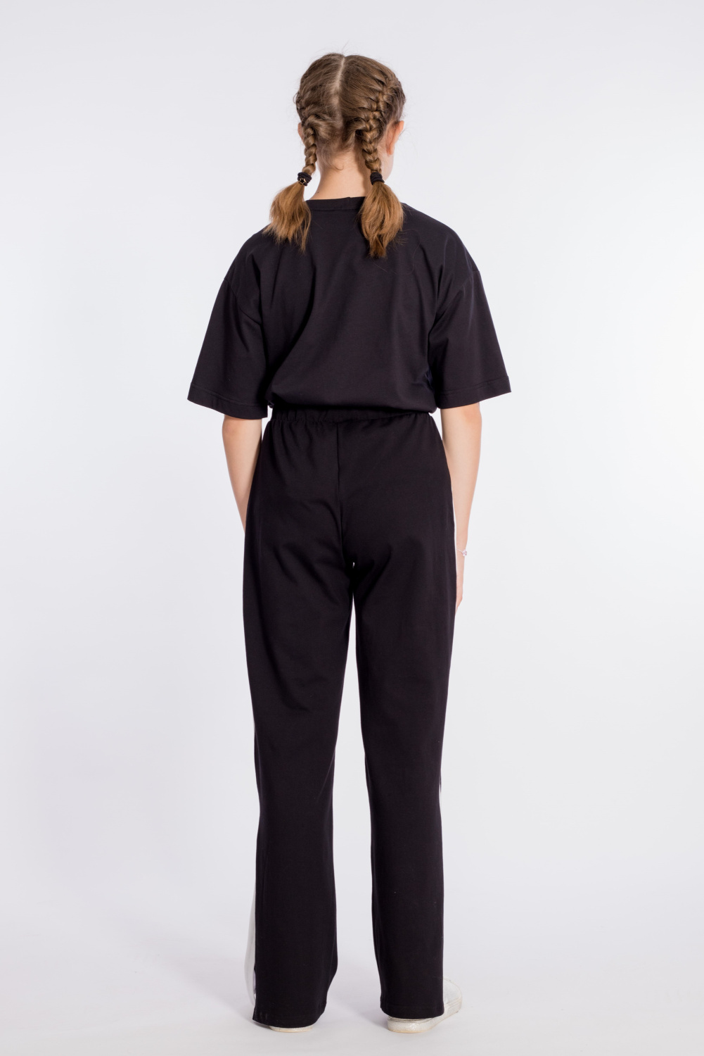 Брюки свободного кроя выполнены из кулирки с лайкрой, с лампасами и разрезами по бокам. Для лучшей фиксации на талии в пояс вставлена резинка и шнур.