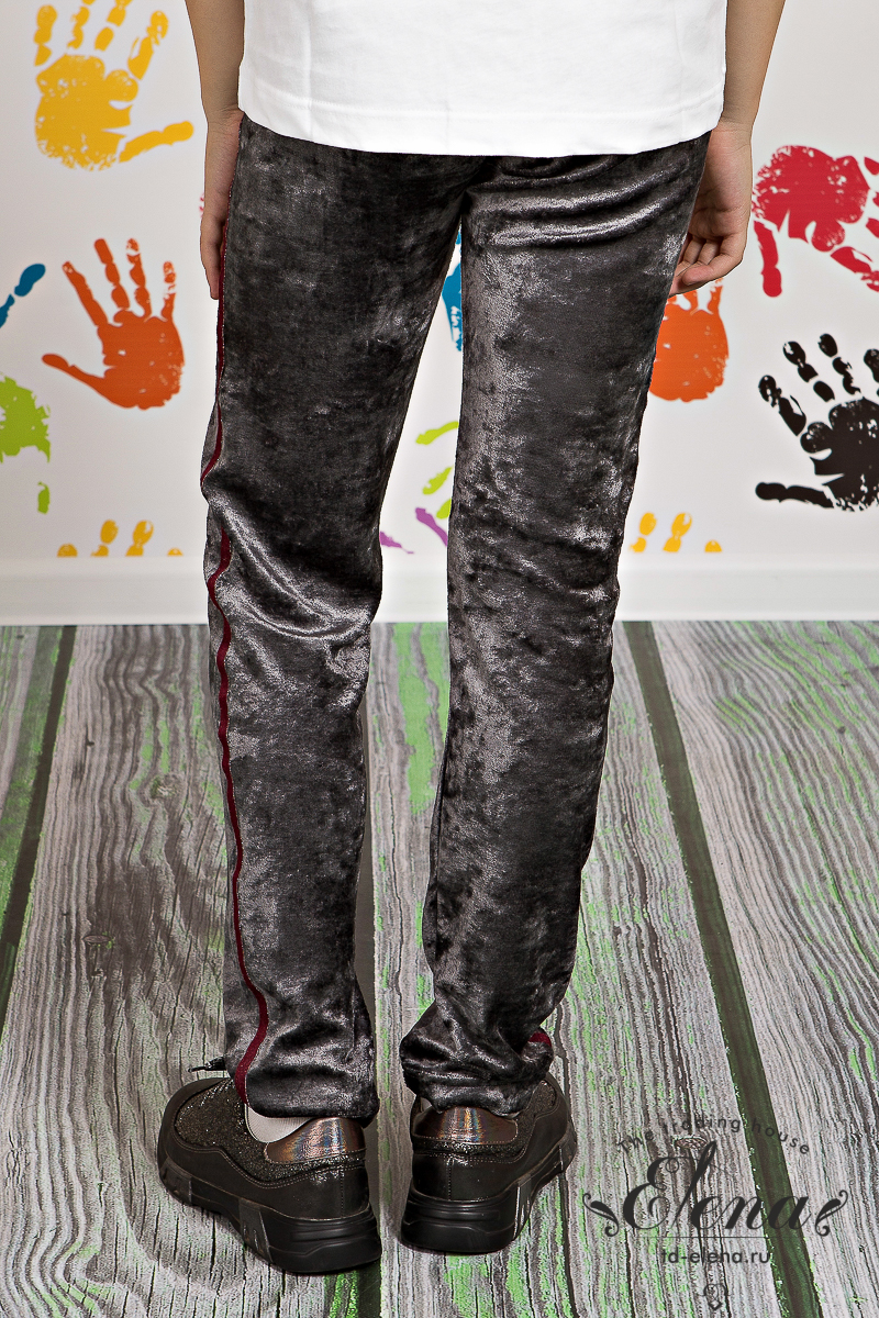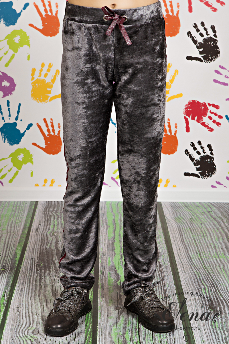 Брюки из велюра, по бокам настрочена декоративная тесьма. Пояс брюк на резинке, через люверсы проложена лента.