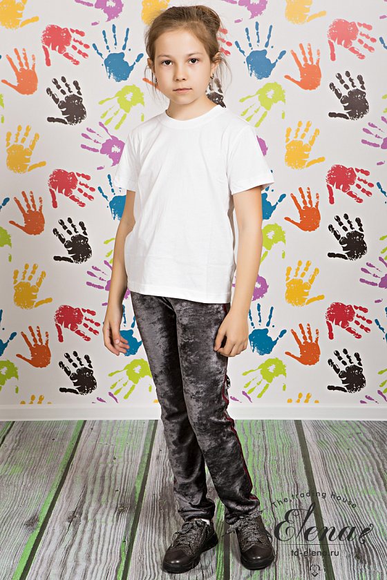 Брюки из велюра, по бокам настрочена декоративная тесьма. Пояс брюк на резинке, через люверсы проложена лента.