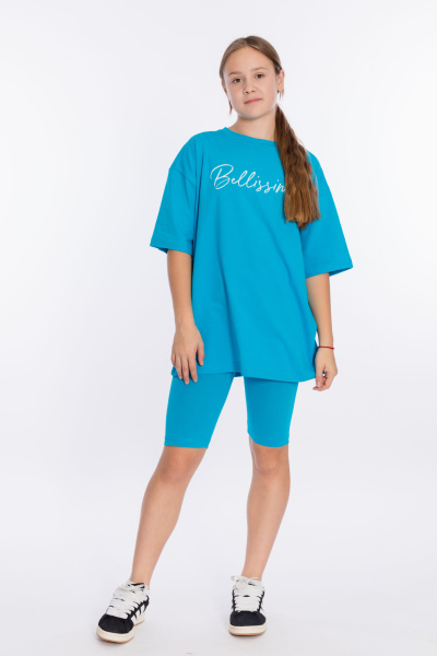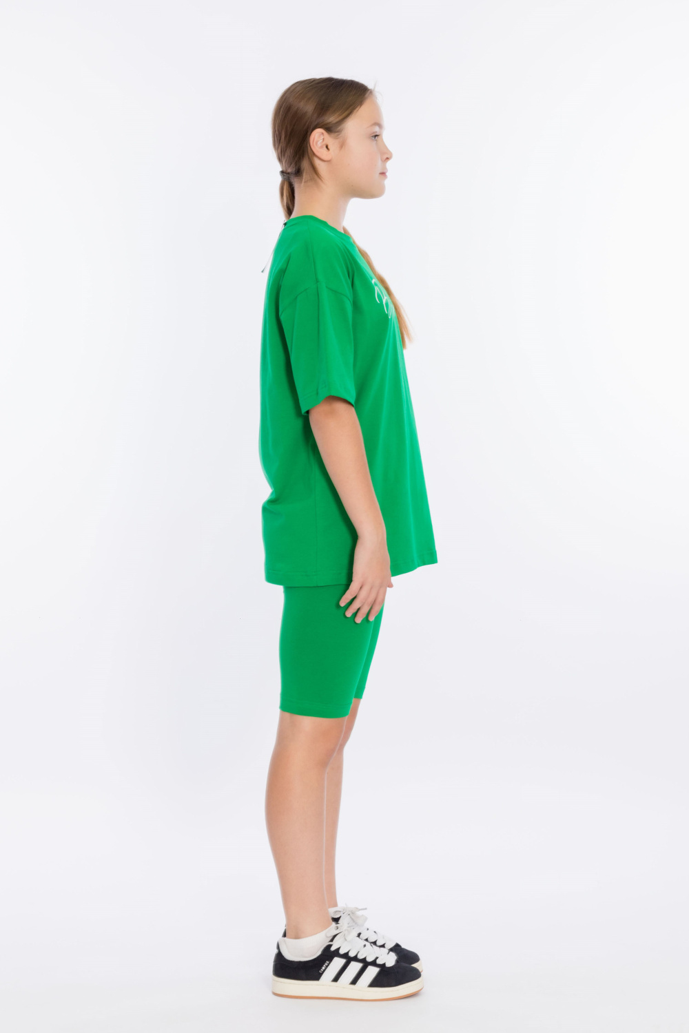 Костюм выполнен из однотонной кулирки с лайкрой, состоит из футболки свободного силуэта и велосипедок. Футболка с коротким втачным рукавом и принтом спереди. Велосипедки с притачным поясом на резине.