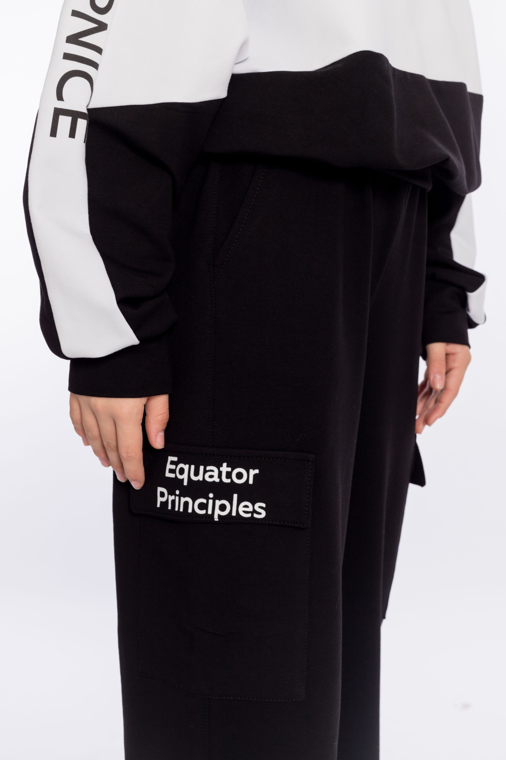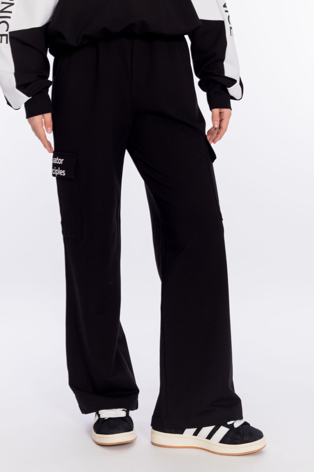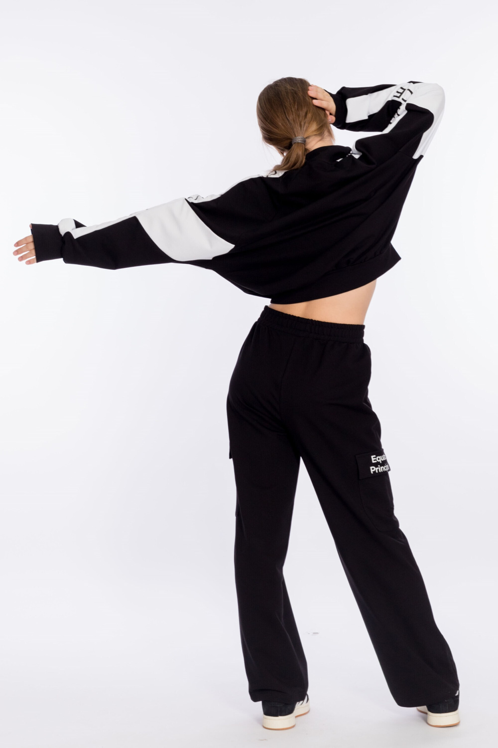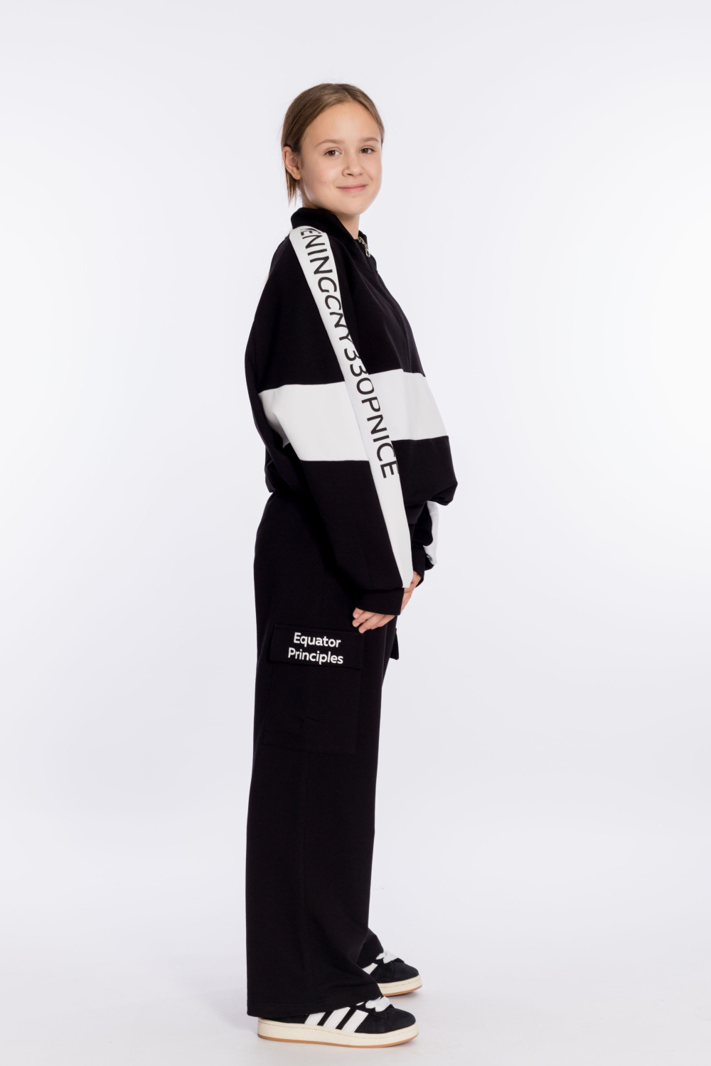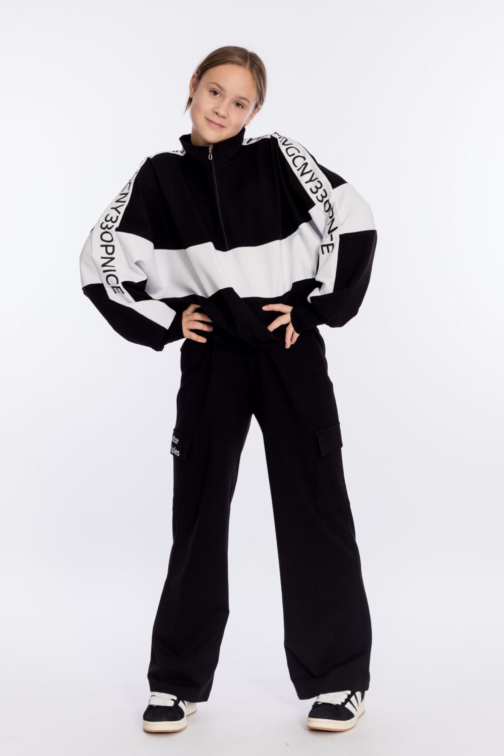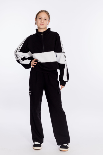 Костюм выполнен из футера с лайкрой. Толстовка свободного покроя с воротником-стойкой с короткой застёжкой на молнию, с притачными манжетами и поясом. Принт на отделочных полосах на толстовке и клапане кармана на брюках. Брюки-карго с притачным поясом, карманами и накладными карманами с клапаном в боковой части.