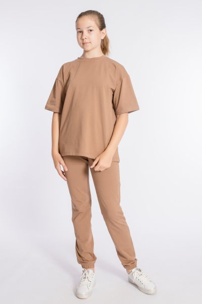 Костюм выполнен из однотонной кулирки с лайкрой, состоит из футболки и брюк. Футболка свободного силуэта, со спущенной линией плеча. Пояс и низ брюк на резине.