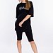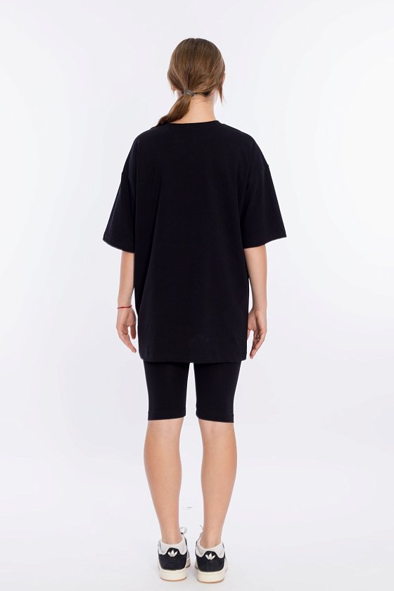 Костюм выполнен из однотонной кулирки с лайкрой, состоит из футболки свободного силуэта и велосипедок. Футболка с коротким втачным рукавом и принтом спереди. Велосипедки с притачным поясом на резине.