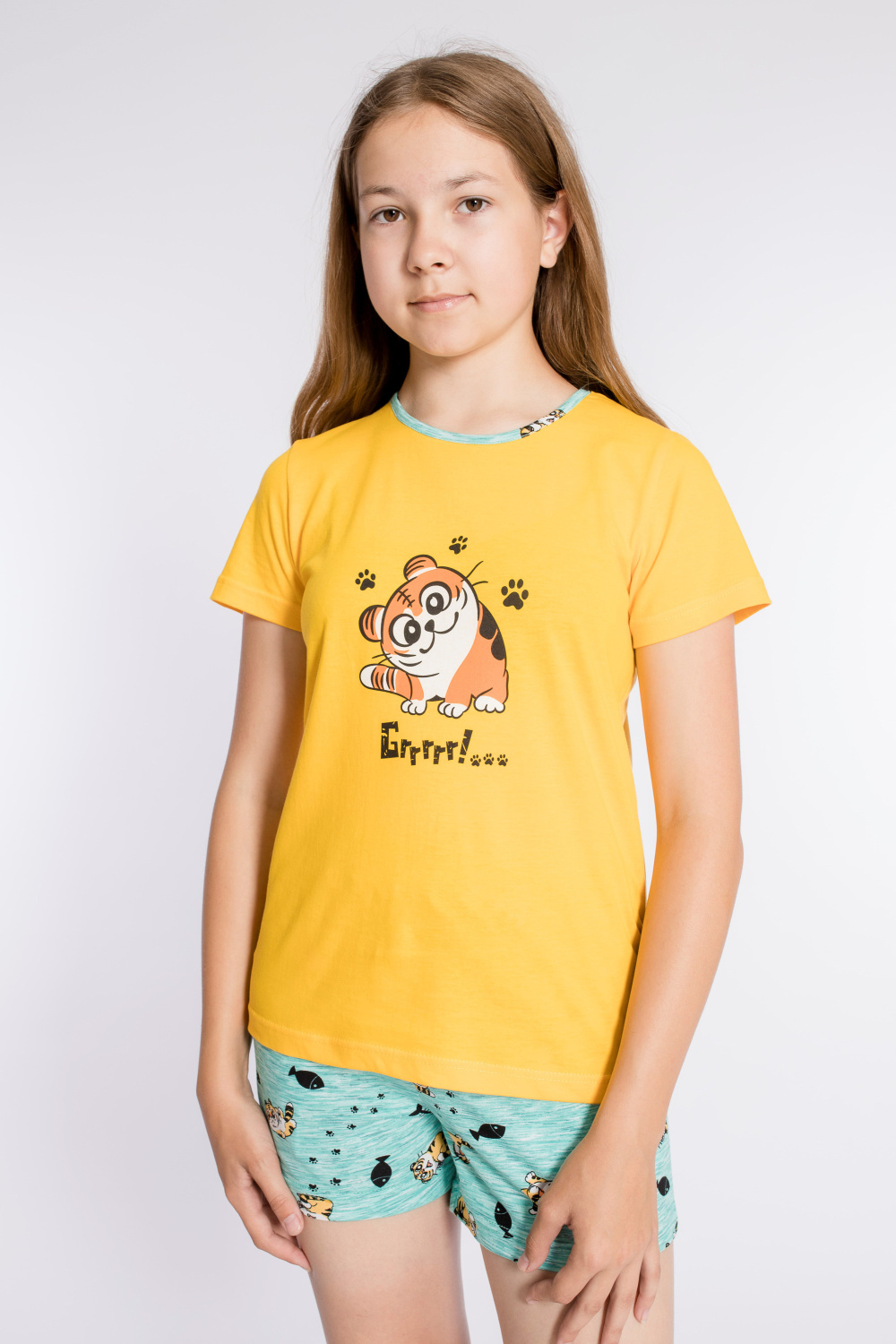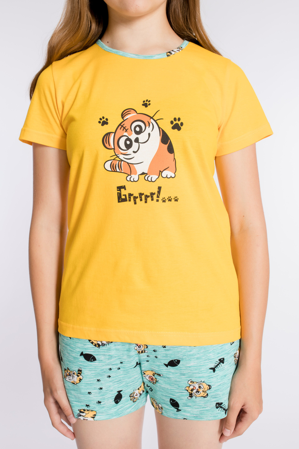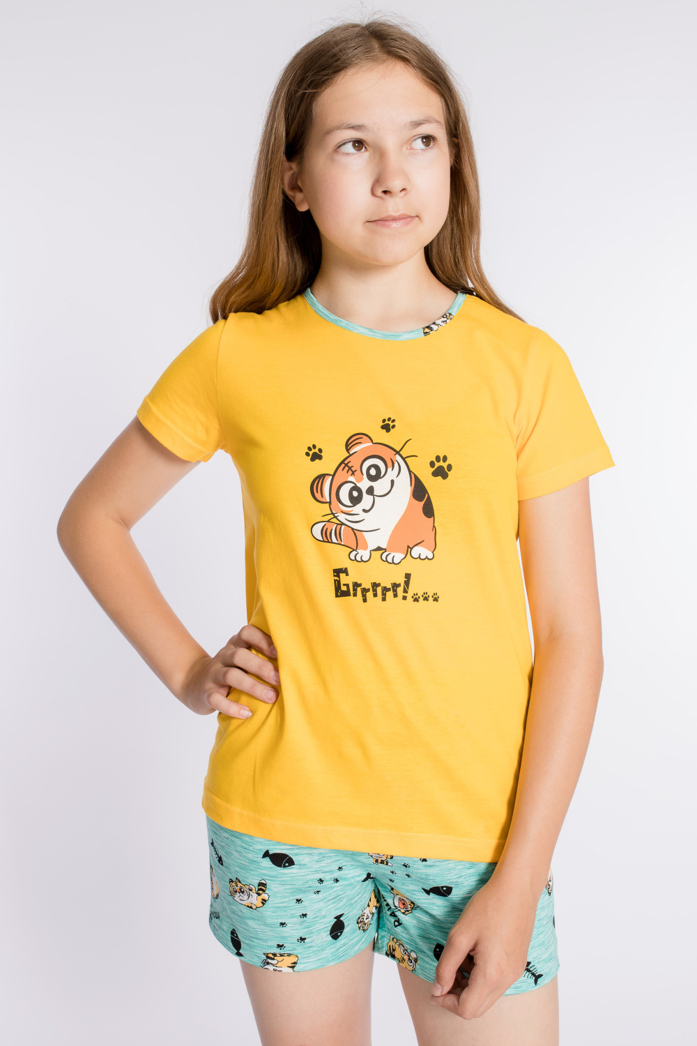 Костюм выполнен из х/б полотна, состоит из футболки и шорт. Футболка с круглым вырезом горловины, обработанным бейкой. Спереди нанесён принт. Шорты с поясом на резине, по бокам расположены карманы.