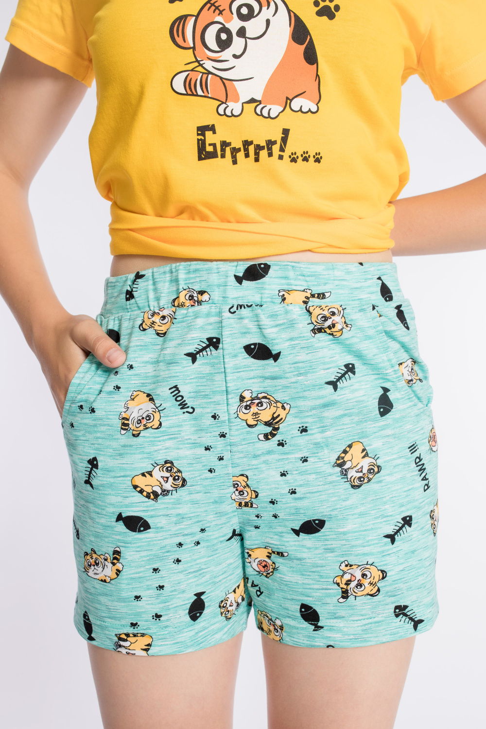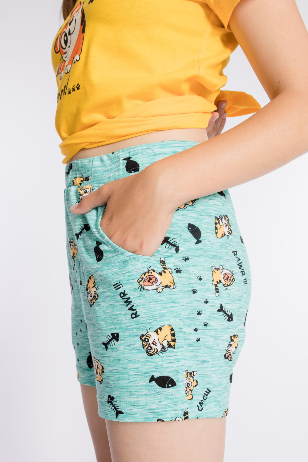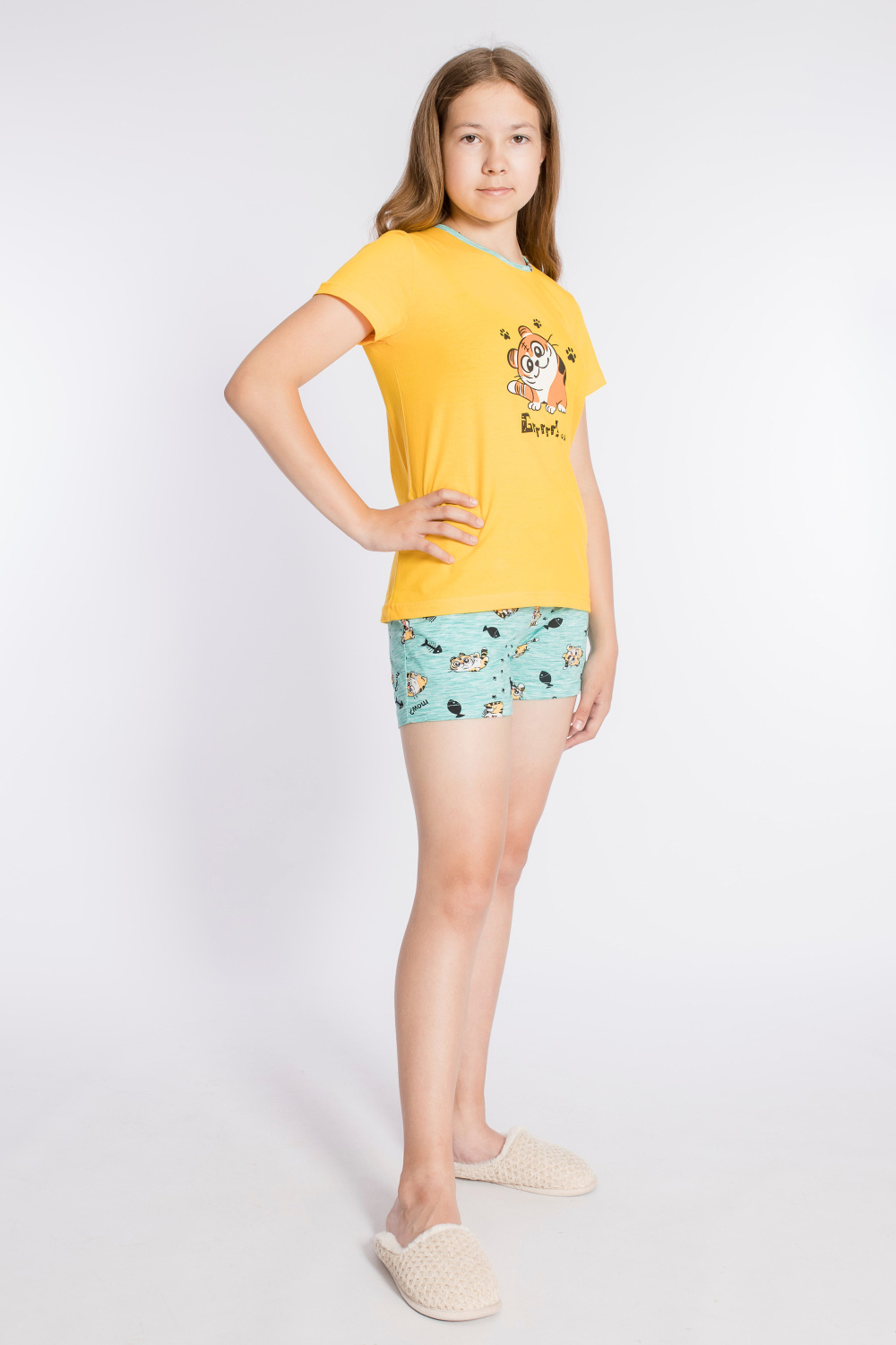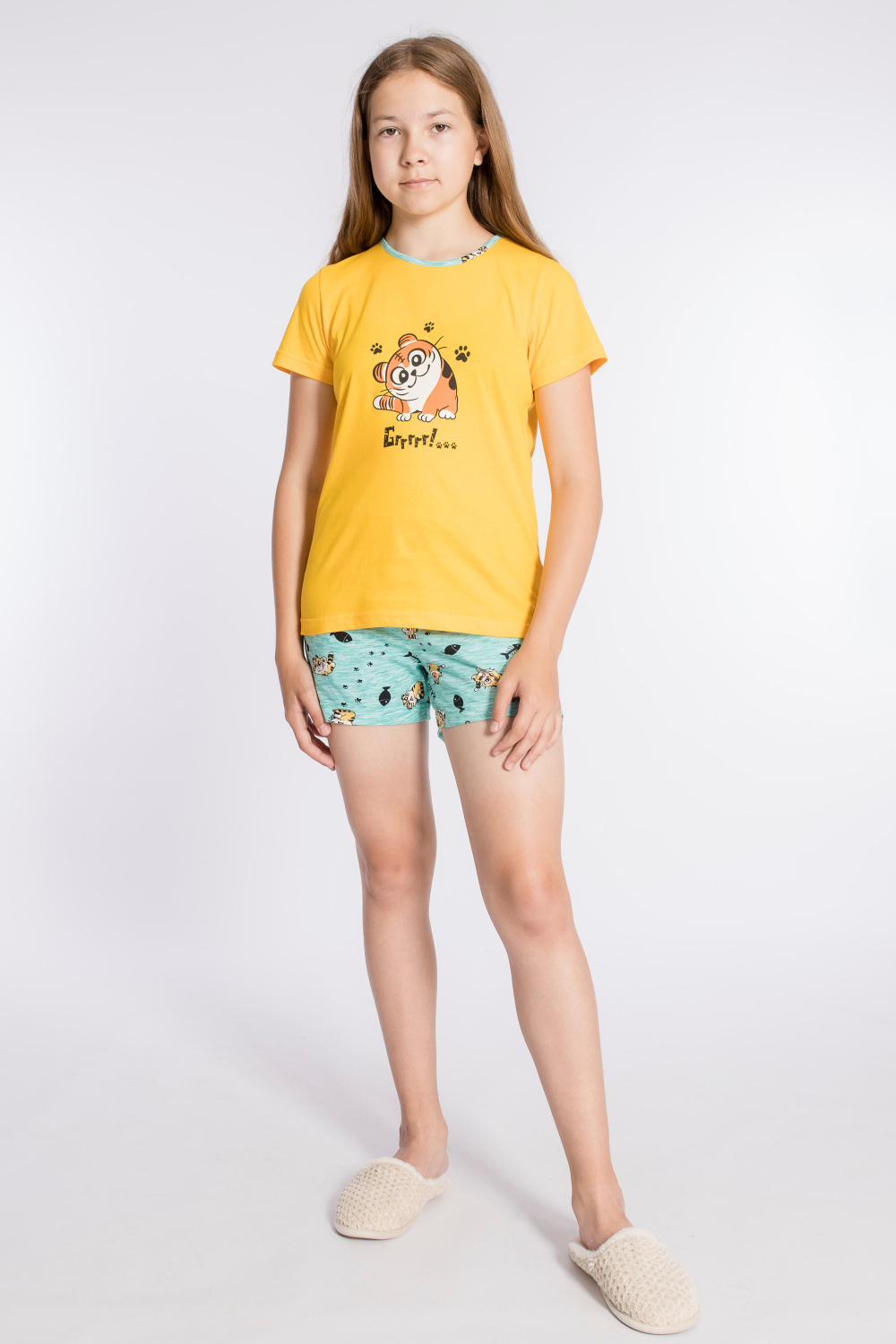 Костюм выполнен из х/б полотна, состоит из футболки и шорт. Футболка с круглым вырезом горловины, обработанным бейкой. Спереди нанесён принт. Шорты с поясом на резине, по бокам расположены карманы.