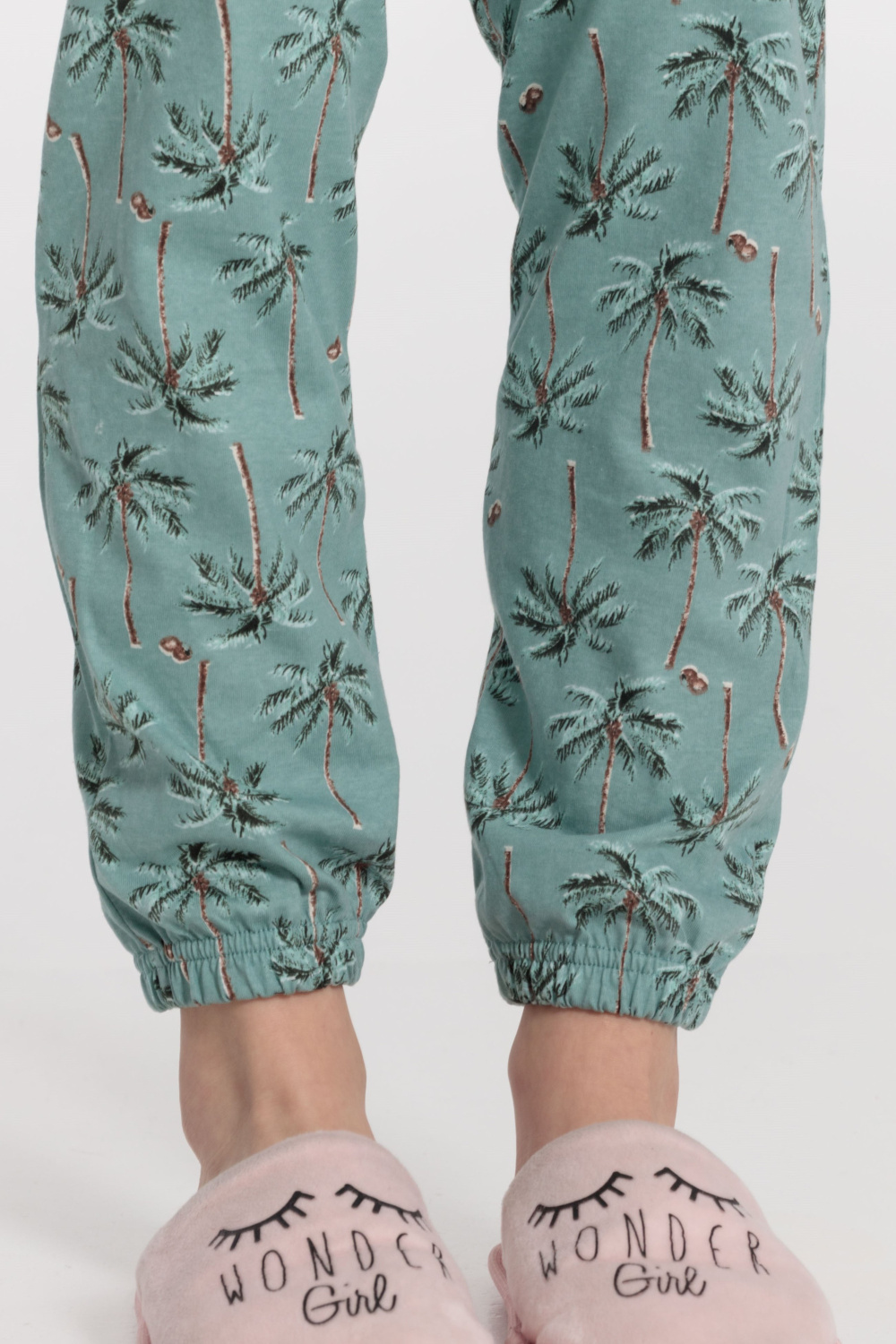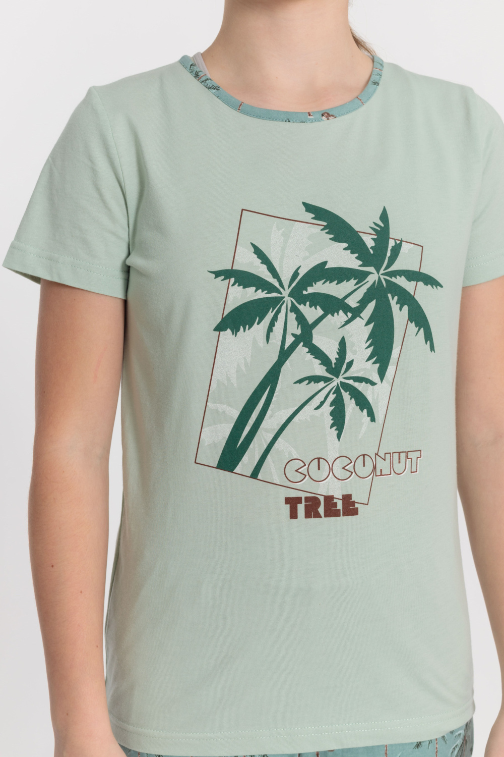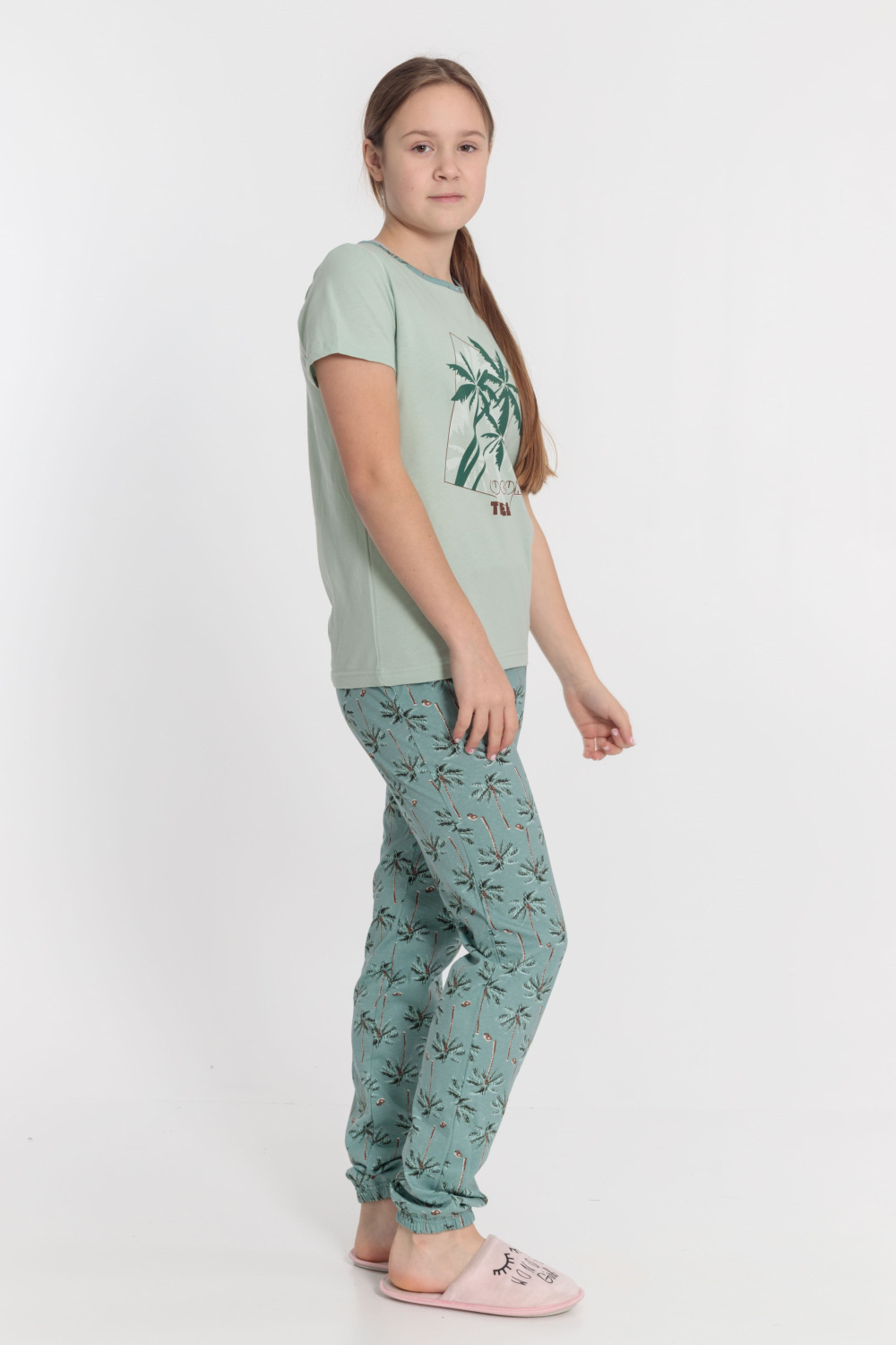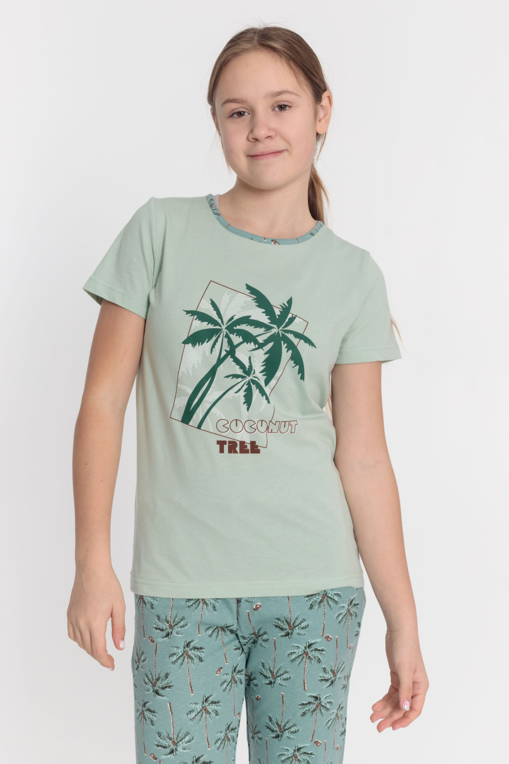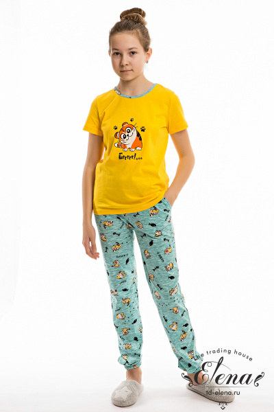 Костюм выполнен из х/б полотна, состоит из футболки и брюк. Футболка с принтом спереди, горловина обработана бейкой. Брюки с карманами по бокам, низ слегка присборен резинкой.