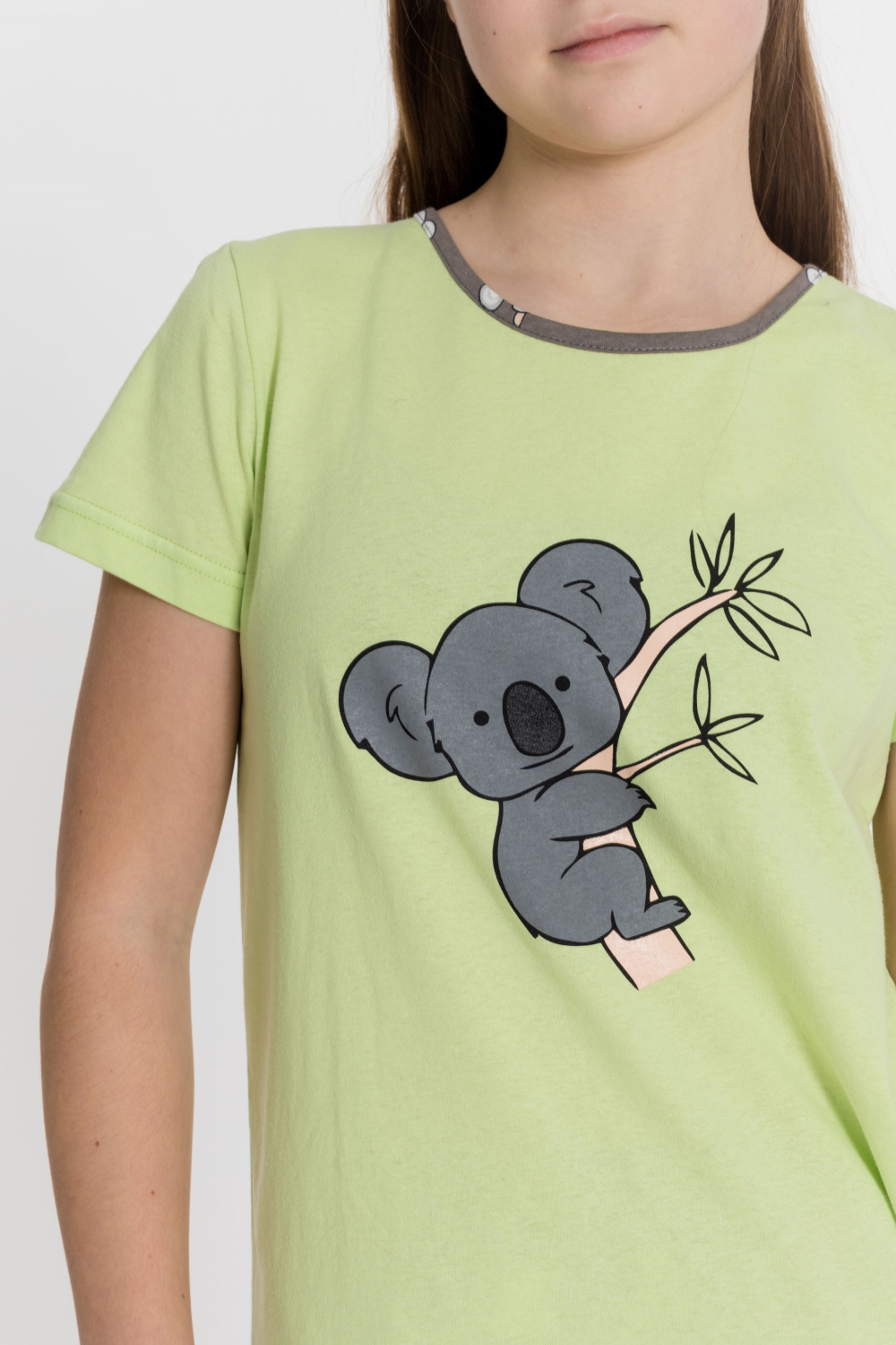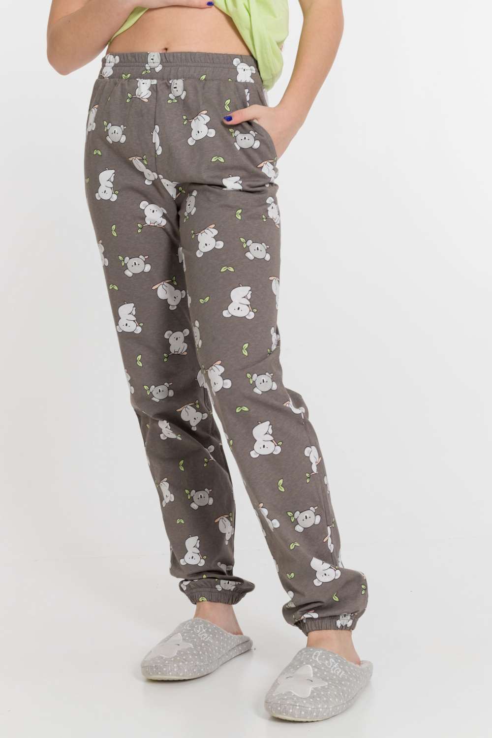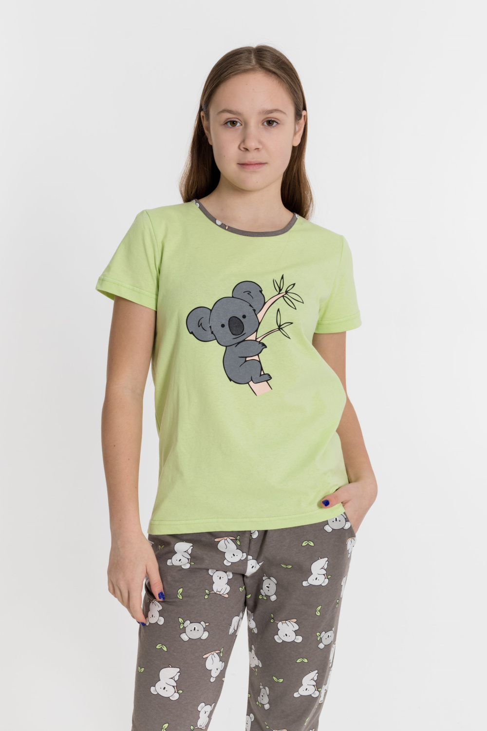 Костюм выполнен из 100% хлопкового полотна, состоит из футболки и брюк. Футболка с принтом спереди, горловина обработана бейкой. Брюки с карманами по бокам, низ слегка присборен резинкой.