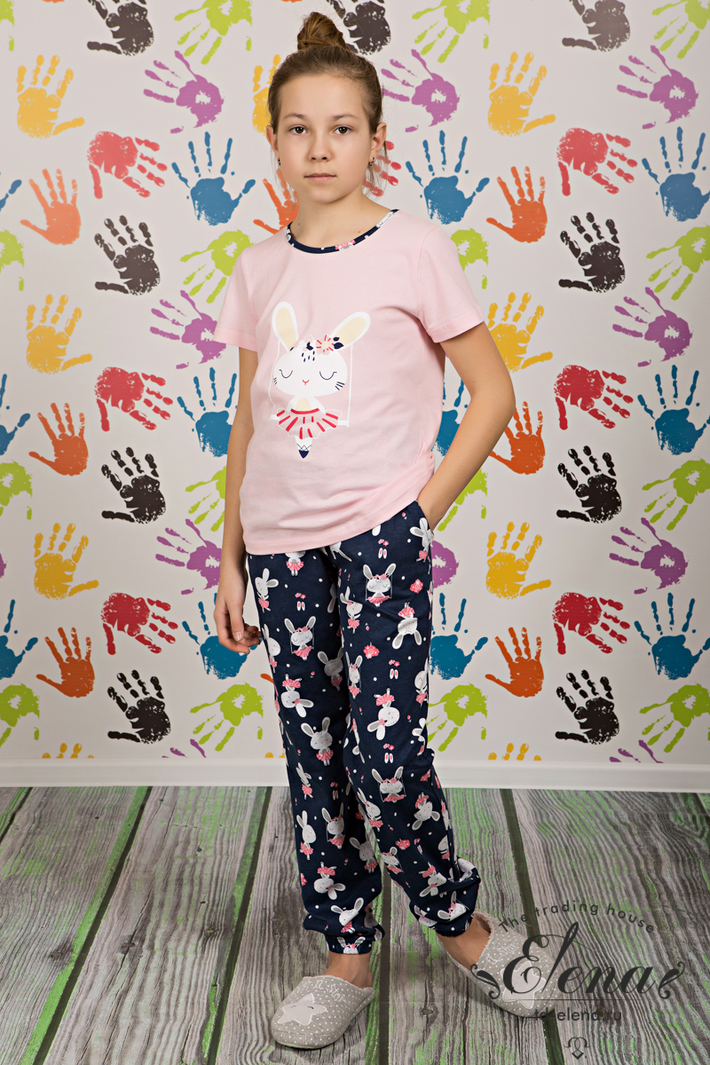Костюм выполнен из х/б полотна, состоит из футболки и брюк. Футболка с принтом спереди, горловина обработана бейкой. Брюки с карманами по бокам, низ слегка присборен резинкой.