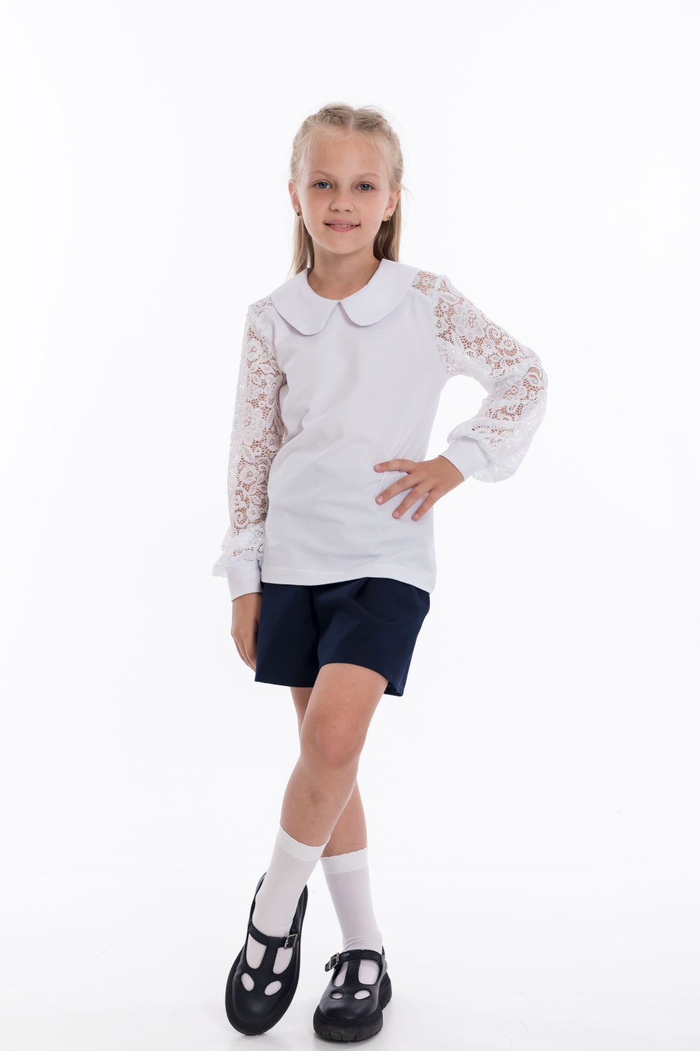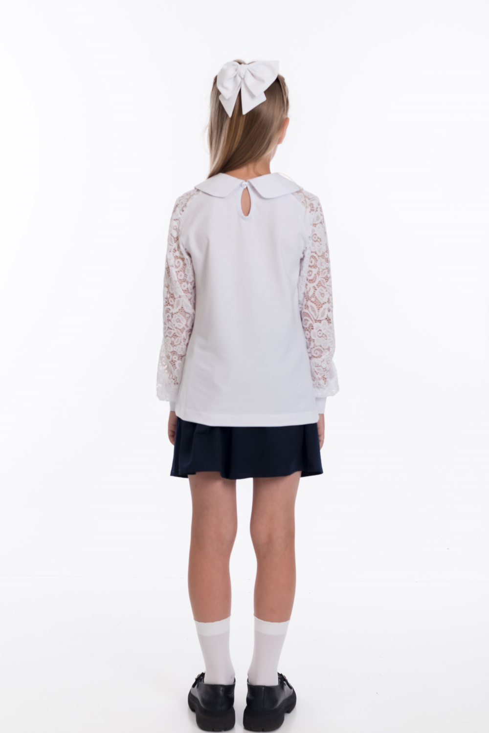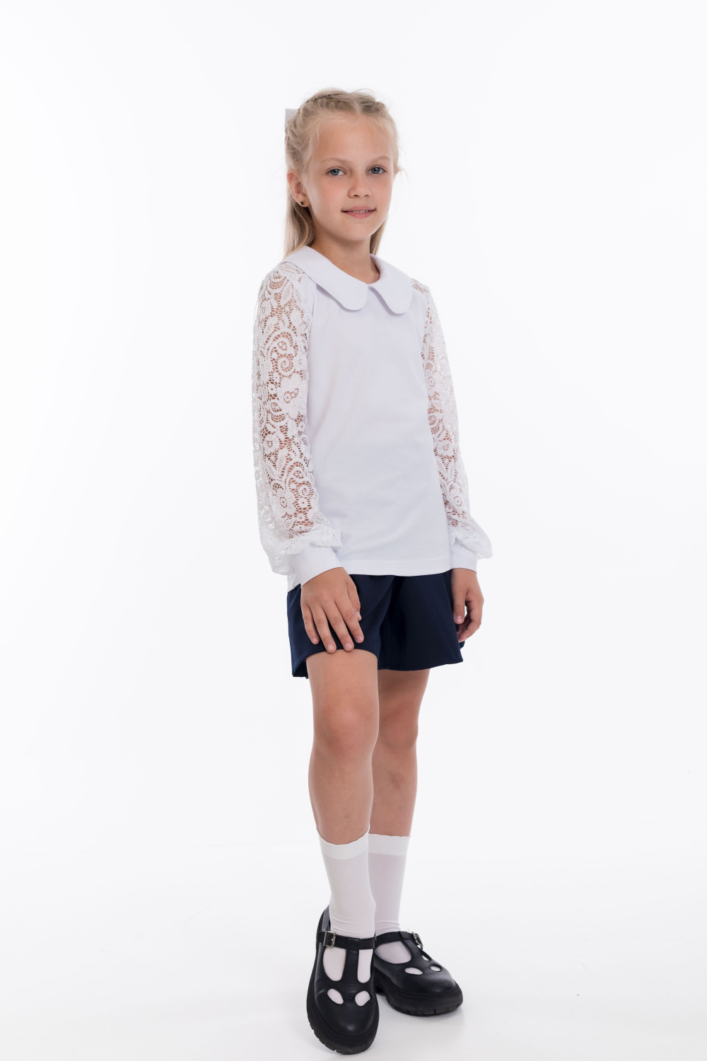 Белый джемпер с длинными кружевными  рукавами — стильный  выбор для школьницы. Изготовлен из материала кулирка с лайкрой, обеспечивает комфорт и свободу движений. Круглый воротник и манжеты из основного материала придают изделию аккуратный вид.