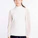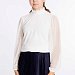Джемпер выполнен из хлопкового полотна с лайкрой. Воротник-стойка, сзади "капля" с застёжкой на пуговицу. Длинные рукава и оборка по краю воротника выполнены из кружева.