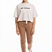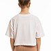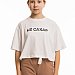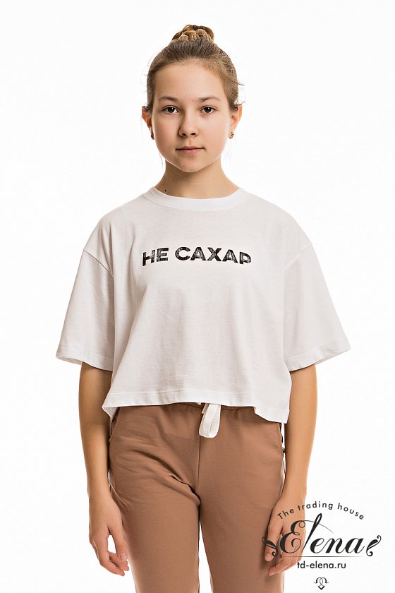 Модная футболка для девочек выполнена из однотонной кулирки. Футболка короткая, свободная, со спущенной линией плеча и рукавом длиной до локтя. Спереди нанесён принт.