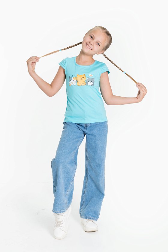 Футболка для девочек с коротким рукавом из хлопка с добавлением лайкры в цвете ментол.