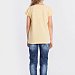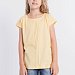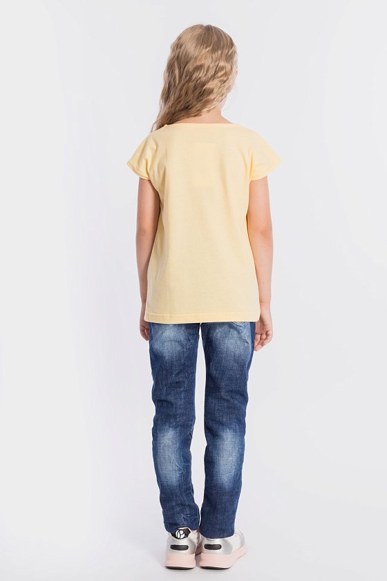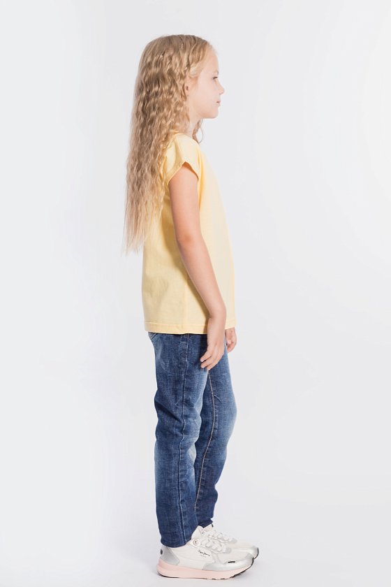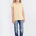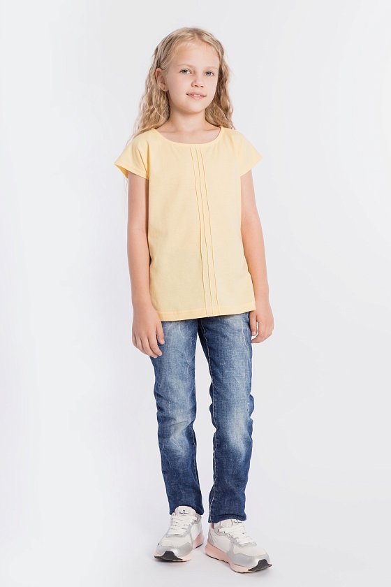 Футболка из однотонной кулирки, со спущенной линией плеча. Горловина с круглым вырезом, спереди по центру футболки три декоративных защипа.