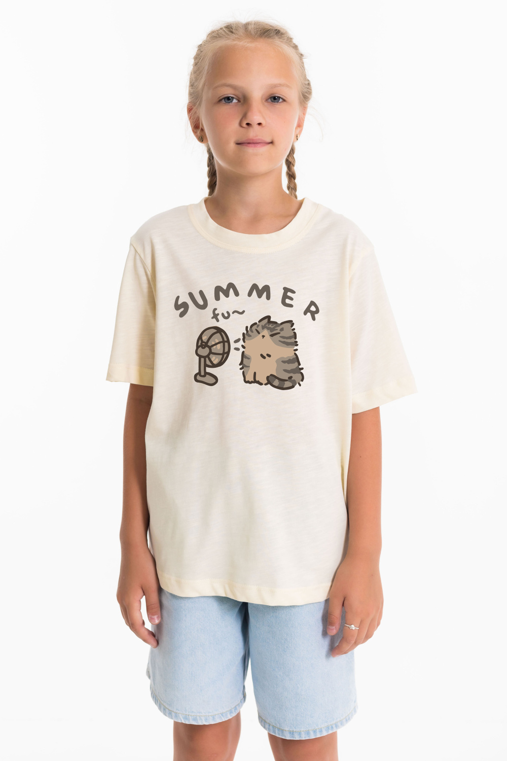 Детская футболка с принтом изготовлена из хлопкового полотна - кулирка "фламли", что обеспечивает комфорт и хорошую воздухопроницаемость. Футболка имеет короткий рукав и круглый вырез горловины, что придает ей классический стильный вид. Такая модель футболки отлично сочетается с джинсами, брюками или юбкой. Изготовленная из натуральной ткани, футболка обеспечит комфорт в течение всего дня.