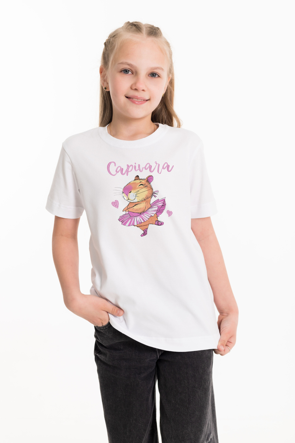 Футболка детская выполнена из кулирки с лайкрой. Горловина с круглым вырезом, спереди нанесен принт.