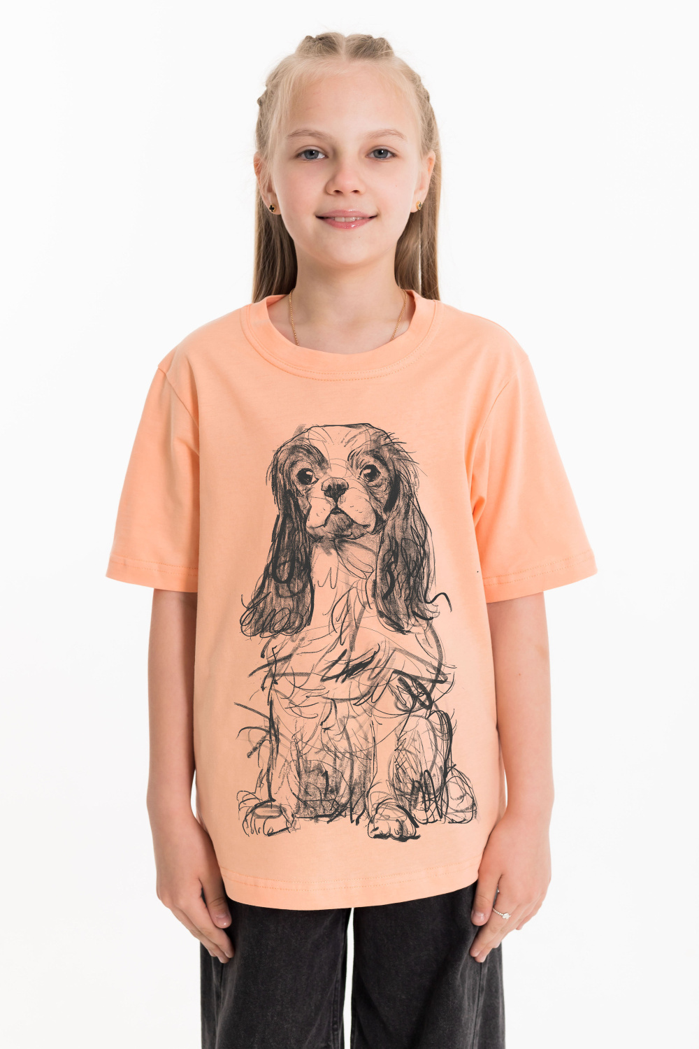 Футболка детская, с коротким рукавом и округлым вырезом горловины, оформленным планкой. Спереди на футболке нанесён оригинальный принт.