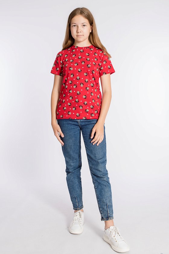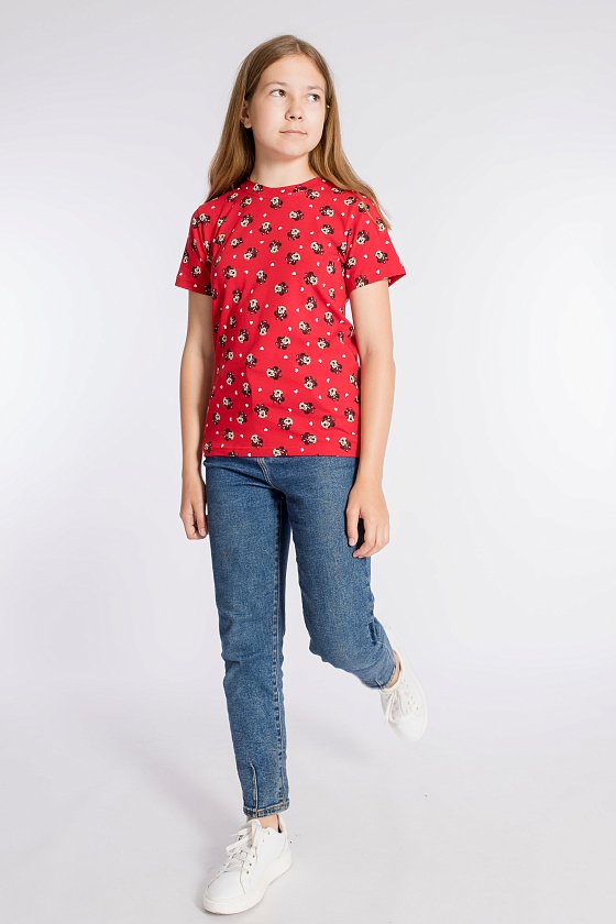 Футболка выполнена из кулирки с лайкрой. С коротким рукавом и круглым вырезом горловины.