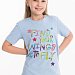 Футболка детская из кулирки с лайкрой с коротким рукавом и округлым вырезом горловины, оформленным планкой. Спереди на футболке принт.