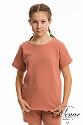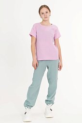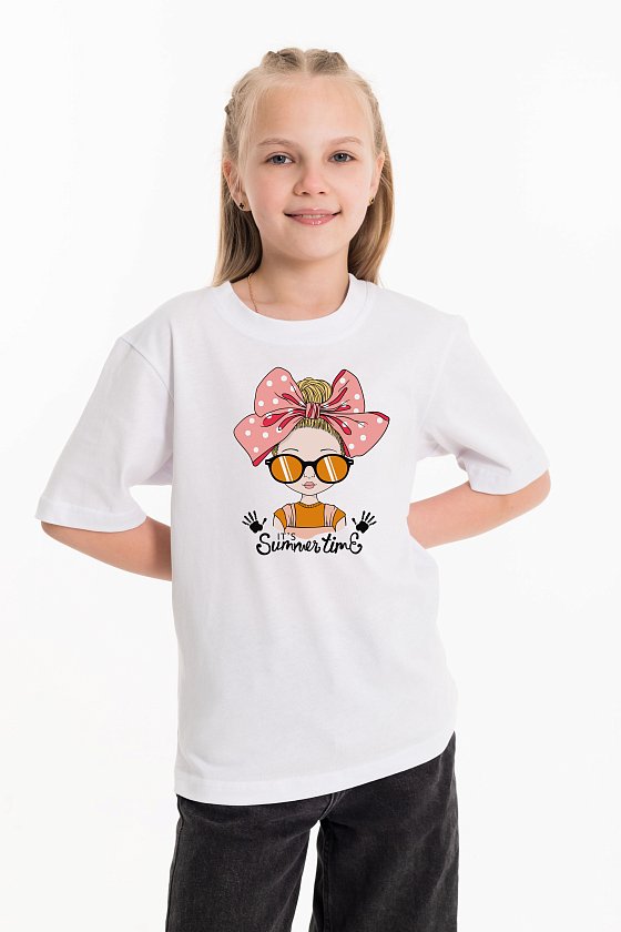Футболка выполнена из однотонной кулирки, 100% хлопок. С коротким рукавом и круглым вырезом горловины, оформленным планкой. Спереди нанесён принт.